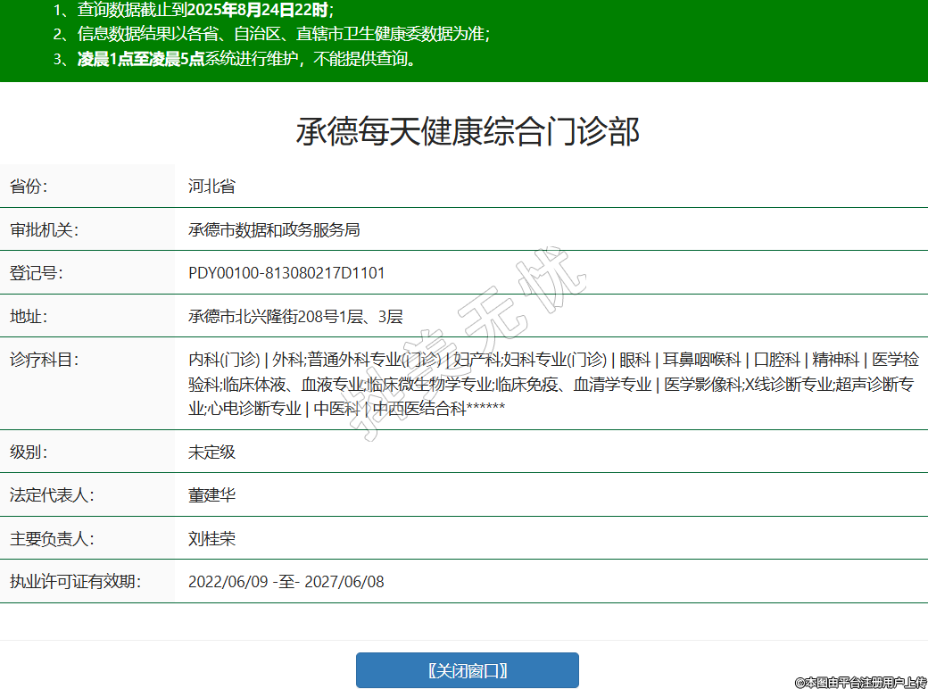 省份:河北省審批機(jī)關(guān):承德市數(shù)據(jù)和政務(wù)服務(wù)局登記號(hào):PDY00100-813080217D1101地址:承德市北興隆街208號(hào)1層、3層診療科目:內(nèi)科(門診) | 外科;普通外科專業(yè)(門診) | 婦產(chǎn)科;婦科專業(yè)(門診) | 眼科 | 耳鼻咽喉科 | 口腔科 | 精神科 | 醫(yī)學(xué)檢驗(yàn)科;臨床體液、血液專業(yè);臨床微生物學(xué)專業(yè);臨床免疫、血清學(xué)專業(yè) | 醫(yī)學(xué)影像科;X線診斷專業(yè);超聲診斷專業(yè);心電診斷專業(yè) | 中醫(yī)科 | 中西醫(yī)結(jié)合科******級(jí)別:未定級(jí)法定代表人:董建華主要負(fù)責(zé)人:劉桂榮執(zhí)業(yè)許可證有效期:2022/06/09 -至- 2027/06/08 -