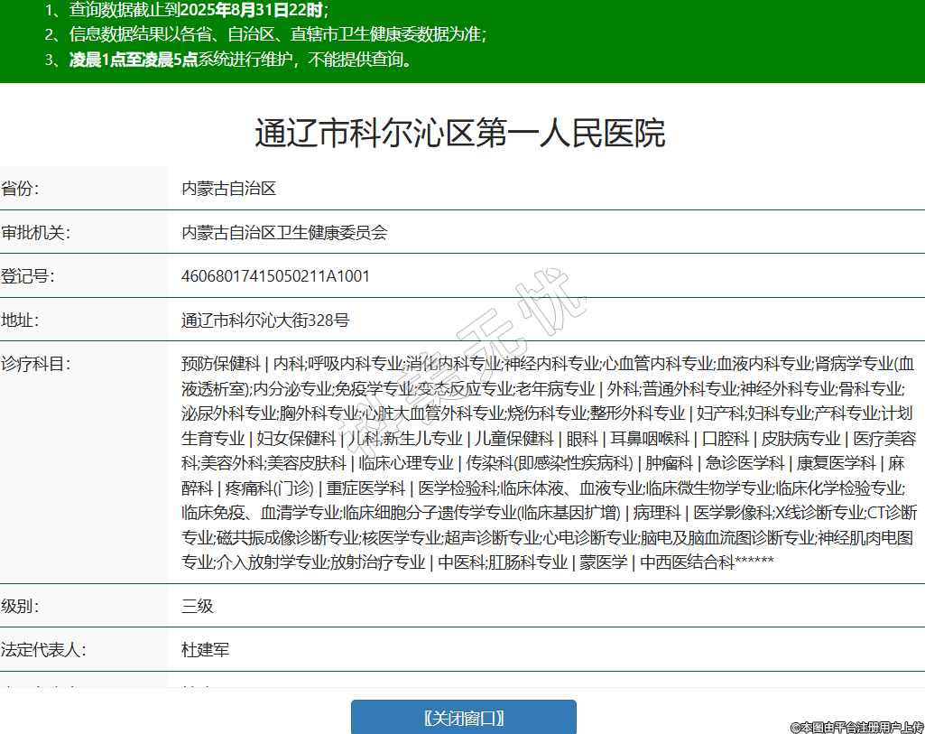 省份:內(nèi)蒙古自治區(qū)審批機(jī)關(guān):內(nèi)蒙古自治區(qū)衛(wèi)生健康委員會(huì)登記號(hào):46068017415050211A1001地址:通遼市科爾沁大街328號(hào)診療科目:預(yù)防保健科 | 內(nèi)科;呼吸內(nèi)科專業(yè);消化內(nèi)科專業(yè);神經(jīng)內(nèi)科專業(yè);心血管內(nèi)科專業(yè);血液內(nèi)科專業(yè);腎病學(xué)專業(yè)(血液透析室);內(nèi)分泌專業(yè);免疫學(xué)專業(yè);變態(tài)反應(yīng)專業(yè);老年病專業(yè) | 外科;普通外科專業(yè);神經(jīng)外科專業(yè);骨科專業(yè);泌尿外科專業(yè);胸外科專業(yè);心臟大血管外科專業(yè);燒傷科專業(yè);整形外科專業(yè) | 婦產(chǎn)科;婦科專業(yè);產(chǎn)科專業(yè);計(jì)劃生育專業(yè) | 婦女保健科 | 兒科;新生兒專業(yè) | 兒童保健科 | 眼科 | 耳鼻咽喉科 | 口腔科 | 皮膚病專業(yè) | 醫(yī)療美容科;美容外科;美容皮膚科 | 臨床心理專業(yè) | 傳染科(即感染性疾病科) | 腫瘤科 | 急診醫(yī)學(xué)科 | 康復(fù)醫(yī)學(xué)科 | 麻醉科 | 疼痛科(門診) | 重癥醫(yī)學(xué)科 | 醫(yī)學(xué)檢驗(yàn)科;臨床體液、血液專業(yè);臨床微生物學(xué)專業(yè);臨床化學(xué)檢驗(yàn)專業(yè);臨床免疫、血清學(xué)專業(yè);臨床細(xì)胞分子遺傳學(xué)專業(yè)(臨床基因擴(kuò)增) | 病理科 | 醫(yī)學(xué)影像科;X線診斷專業(yè);CT診斷專業(yè);磁共振成像診斷專業(yè);核醫(yī)學(xué)專業(yè);超聲診斷專業(yè);心電診斷專業(yè);腦電及腦血流圖診斷專業(yè);神經(jīng)肌肉電圖專業(yè);介入放射學(xué)專業(yè);放射治療專業(yè) | 中醫(yī)科;肛腸科專業(yè) | 蒙醫(yī)學(xué) | 中西醫(yī)結(jié)合科******級(jí)別:三級(jí)法定代表人:杜建軍主要負(fù)責(zé)人:杜建軍執(zhí)業(yè)許可證有效期:2025/02/13 -至- 2039/12/15 -