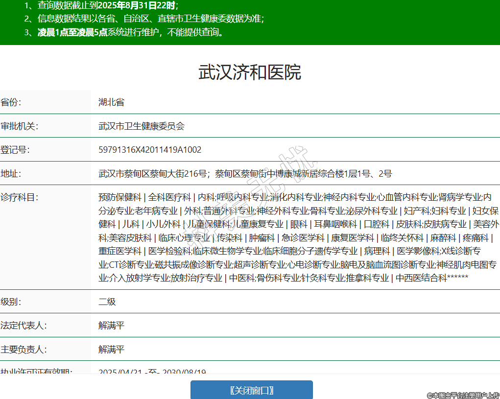 省份:湖北省審批機關(guān):武漢市衛(wèi)生健康委員會登記號:59791316X42011419A1002地址:武漢市蔡甸區(qū)蔡甸大街216號;蔡甸區(qū)蔡甸街中博康城新居綜合樓1層1號、2號診療科目:預防保健科 | 全科醫(yī)療科 | 內(nèi)科;呼吸內(nèi)科專業(yè);消化內(nèi)科專業(yè);神經(jīng)內(nèi)科專業(yè);心血管內(nèi)科專業(yè);腎病學專業(yè);內(nèi)分泌專業(yè);老年病專業(yè) | 外科;普通外科專業(yè);神經(jīng)外科專業(yè);骨科專業(yè);泌尿外科專業(yè) | 婦產(chǎn)科;婦科專業(yè) | 婦女保健科 | 兒科 | 小兒外科 | 兒童保健科;兒童康復專業(yè) | 眼科 | 耳鼻咽喉科 | 口腔科 | 皮膚科;皮膚病專業(yè) | 美容外科;美容皮膚科 | 臨床心理專業(yè) | 傳染科 | 腫瘤科 | 急診醫(yī)學科 | 康復醫(yī)學科 | 臨終關(guān)懷科 | 麻醉科 | 疼痛科 | 重癥醫(yī)學科 | 醫(yī)學檢驗科;臨床微生物學專業(yè);臨床細胞分子遺傳學專業(yè) | 病理科 | 醫(yī)學影像科;X線診斷專業(yè);CT診斷專業(yè);磁共振成像診斷專業(yè);超聲診斷專業(yè);心電診斷專業(yè);腦電及腦血流圖診斷專業(yè);神經(jīng)肌肉電圖專業(yè);介入放射學專業(yè);放射治療專業(yè) | 中醫(yī)科;骨傷科專業(yè);針灸科專業(yè);推拿科專業(yè) | 中西醫(yī)結(jié)合科******級別:二級法定代表人:解滿平主要負責人:解滿平執(zhí)業(yè)許可證有效期:2025/04/21 -至- 2030/08/19 -