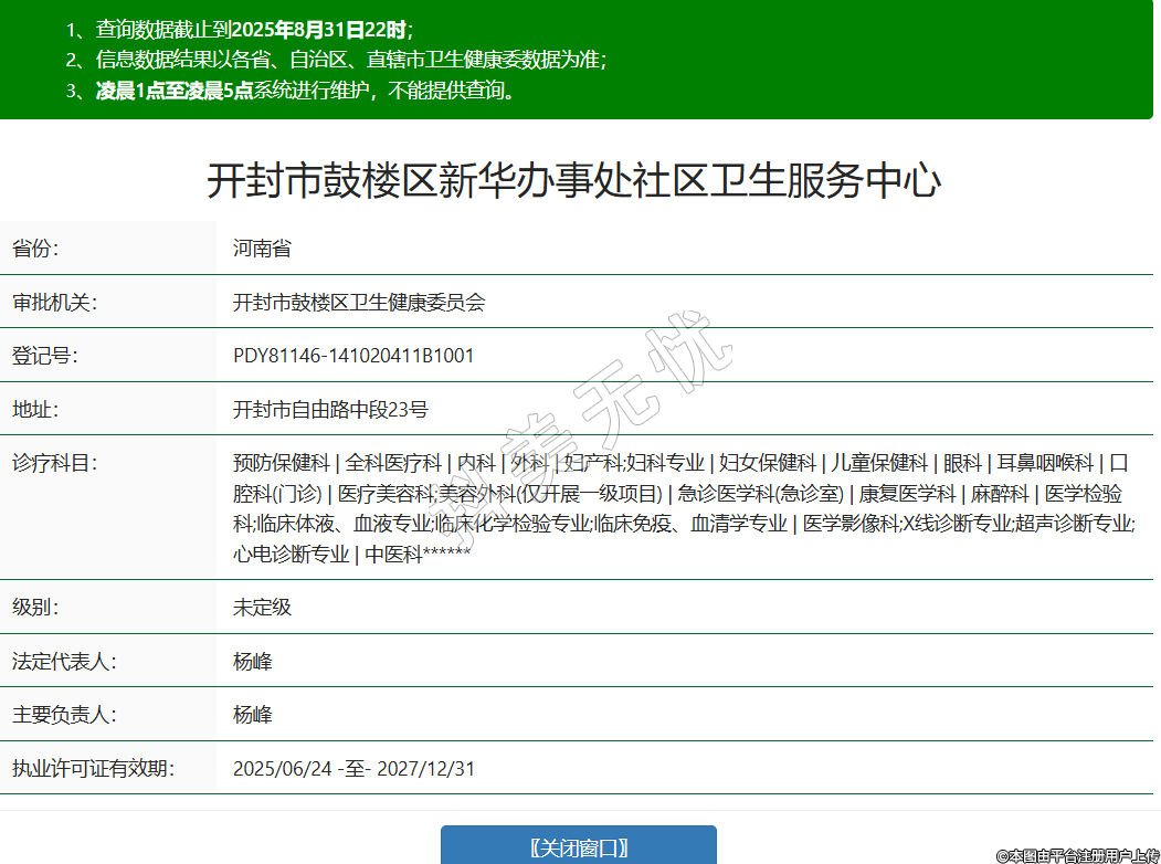 省份:河南省審批機(jī)關(guān):開封市鼓樓區(qū)衛(wèi)生健康委員會(huì)登記號(hào):PDY81146-141020411B1001地址:開封市自由路中段23號(hào)診療科目:預(yù)防保健科 | 全科醫(yī)療科 | 內(nèi)科 | 外科 | 婦產(chǎn)科;婦科專業(yè) | 婦女保健科 | 兒童保健科 | 眼科 | 耳鼻咽喉科 | 口腔科(門診) | 醫(yī)療美容科;美容外科(僅開展一級(jí)項(xiàng)目) | 急診醫(yī)學(xué)科(急診室) | 康復(fù)醫(yī)學(xué)科 | 麻醉科 | 醫(yī)學(xué)檢驗(yàn)科;臨床體液、血液專業(yè);臨床化學(xué)檢驗(yàn)專業(yè);臨床免疫、血清學(xué)專業(yè) | 醫(yī)學(xué)影像科;X線診斷專業(yè);超聲診斷專業(yè);心電診斷專業(yè) | 中醫(yī)科******級(jí)別:未定級(jí)法定代表人:楊峰主要負(fù)責(zé)人:楊峰執(zhí)業(yè)許可證有效期:2025/06/24 -至- 2027/12/31 -