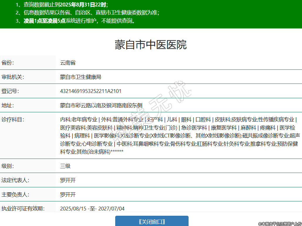 省份:云南省審批機(jī)關(guān):蒙自市衛(wèi)生健康局登記號:43214691953252211A2101地址:蒙自市彩云路以南及銀河路南段東側(cè)診療科目:內(nèi)科;老年病專業(yè) | 外科;普通外科專業(yè) | 婦產(chǎn)科 | 兒科 | 眼科 | 口腔科 | 皮膚科;皮膚病專業(yè);性傳播疾病專業(yè) | 醫(yī)療美容科;美容皮膚科 | 精神科;精神衛(wèi)生專業(yè)(門診) | 急診醫(yī)學(xué)科 | 康復(fù)醫(yī)學(xué)科 | 麻醉科 | 疼痛科 | 醫(yī)學(xué)檢驗(yàn)科 | 病理科 | 醫(yī)學(xué)影像科;X線診斷專業(yè)(X射線CT影像診斷、其他X射線影像診斷);磁共振成像診斷專業(yè);超聲診斷專業(yè);心電診斷專業(yè) | 中醫(yī)科;耳鼻咽喉科專業(yè);骨傷科專業(yè);肛腸科專業(yè);針灸科專業(yè);推拿科專業(yè);預(yù)防保健科專業(yè);其他(治未病科)******級別:三級法定代表人:羅開開主要負(fù)責(zé)人:羅開開執(zhí)業(yè)許可證有效期:2025/08/15 -至- 2027/07/04 -