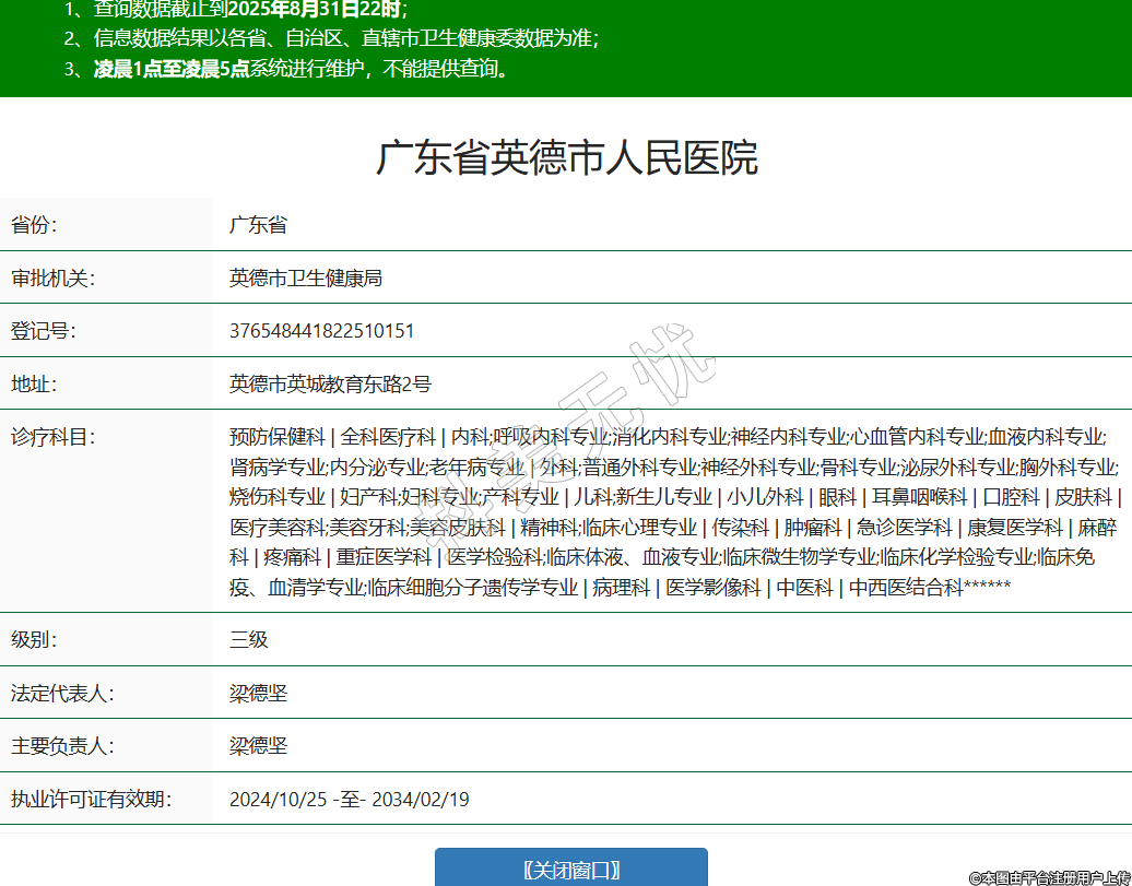 省份:廣東省審批機關:英德市衛(wèi)生健康局登記號:376548441822510151地址:英德市英城教育東路2號診療科目:預防保健科 | 全科醫(yī)療科 | 內科;呼吸內科專業(yè);消化內科專業(yè);神經內科專業(yè);心血管內科專業(yè);血液內科專業(yè);腎病學專業(yè);內分泌專業(yè);老年病專業(yè) | 外科;普通外科專業(yè);神經外科專業(yè);骨科專業(yè);泌尿外科專業(yè);胸外科專業(yè);燒傷科專業(yè) | 婦產科;婦科專業(yè);產科專業(yè) | 兒科;新生兒專業(yè) | 小兒外科 | 眼科 | 耳鼻咽喉科 | 口腔科 | 皮膚科 | 醫(yī)療美容科;美容牙科;美容皮膚科 | 精神科;臨床心理專業(yè) | 傳染科 | 腫瘤科 | 急診醫(yī)學科 | 康復醫(yī)學科 | 麻醉科 | 疼痛科 | 重癥醫(yī)學科 | 醫(yī)學檢驗科;臨床體液、血液專業(yè);臨床微生物學專業(yè);臨床化學檢驗專業(yè);臨床免疫、血清學專業(yè);臨床細胞分子遺傳學專業(yè) | 病理科 | 醫(yī)學影像科 | 中醫(yī)科 | 中西醫(yī)結合科******級別:三級法定代表人:梁德堅主要負責人:梁德堅執(zhí)業(yè)許可證有效期:2024/10/25 -至- 2034/02/19 -