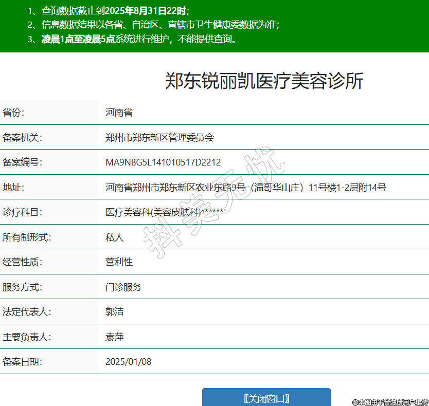 省份:河南省備案機(jī)關(guān):鄭州市鄭東新區(qū)管理委員會(huì)備案編號(hào):MA9NBG5L141010517D2212地址:河南省鄭州市鄭東新區(qū)農(nóng)業(yè)東路9號(hào)(溫哥華山莊)11號(hào)樓1-2層附14號(hào)診療科目:醫(yī)療美容科(美容皮膚科)******所有制形式:私人經(jīng)營(yíng)性質(zhì):營(yíng)利性服務(wù)方式:門診服務(wù)法定代表人:郭潔主要負(fù)責(zé)人:袁萍備案日期:2025/01/08 -