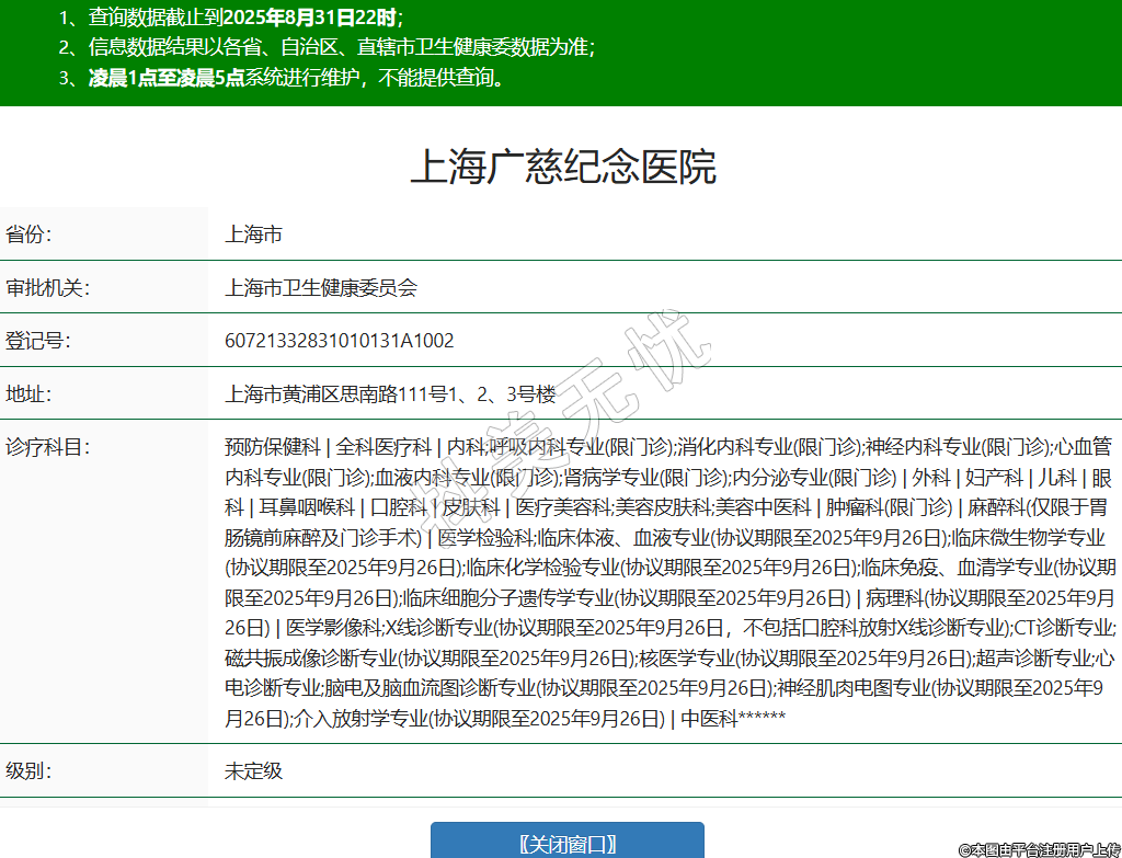 省份:上海市審批機關:上海市衛(wèi)生健康委員會登記號:60721332831010131A1002地址:上海市黃浦區(qū)思南路111號1、2、3號樓診療科目:預防保健科 | 全科醫(yī)療科 | 內(nèi)科;呼吸內(nèi)科專業(yè)(限門診);消化內(nèi)科專業(yè)(限門診);神經(jīng)內(nèi)科專業(yè)(限門診);心血管內(nèi)科專業(yè)(限門診);血液內(nèi)科專業(yè)(限門診);腎病學專業(yè)(限門診);內(nèi)分泌專業(yè)(限門診) | 外科 | 婦產(chǎn)科 | 兒科 | 眼科 | 耳鼻咽喉科 | 口腔科 | 皮膚科 | 醫(yī)療美容科;美容皮膚科;美容中醫(yī)科 | 腫瘤科(限門診) | 麻醉科(僅限于胃腸鏡前麻醉及門診手術) | 醫(yī)學檢驗科;臨床體液、血液專業(yè)(協(xié)議期限至2025年9月26日);臨床微生物學專業(yè)(協(xié)議期限至2025年9月26日);臨床化學檢驗專業(yè)(協(xié)議期限至2025年9月26日);臨床免疫、血清學專業(yè)(協(xié)議期限至2025年9月26日);臨床細胞分子遺傳學專業(yè)(協(xié)議期限至2025年9月26日) | 病理科(協(xié)議期限至2025年9月26日) | 醫(yī)學影像科;X線診斷專業(yè)(協(xié)議期限至2025年9月26日,不包括口腔科放射X線診斷專業(yè));CT診斷專業(yè);磁共振成像診斷專業(yè)(協(xié)議期限至2025年9月26日);核醫(yī)學專業(yè)(協(xié)議期限至2025年9月26日);超聲診斷專業(yè);心電診斷專業(yè);腦電及腦血流圖診斷專業(yè)(協(xié)議期限至2025年9月26日);神經(jīng)肌肉電圖專業(yè)(協(xié)議期限至2025年9月26日);介入放射學專業(yè)(協(xié)議期限至2025年9月26日) | 中醫(yī)科******級別:未定級法定代表人:俞郁萍主要負責人:張晨莉執(zhí)業(yè)許可證有效期:2024/04/09 -至- 2029/04/08 -
