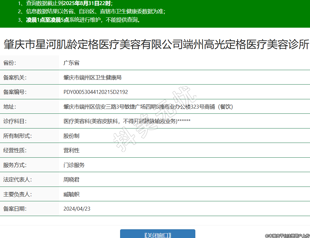 省份:廣東省備案機(jī)關(guān):肇慶市端州區(qū)衛(wèi)生健康局備案編號(hào):PDY00053044120215D2192地址:肇慶市端州區(qū)信安三路3號(hào)敏捷廣場(chǎng)四期B幢商業(yè)辦公樓323號(hào)商鋪(餐飲)診療科目:醫(yī)療美容科(美容皮膚科,不得開展靜脈輸液業(yè)務(wù))******所有制形式:股份制經(jīng)營(yíng)性質(zhì):營(yíng)利性服務(wù)方式:門診服務(wù)法定代表人:周曉君主要負(fù)責(zé)人:臧毓幟備案日期:2024/04/23 -