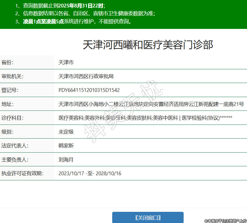 省份:天津市審批機(jī)關(guān):天津市河西區(qū)行政審批局登記號(hào):PDY66411512010315D1542地址:天津市河西區(qū)小海地小二樓云江里地塊定向安置經(jīng)濟(jì)適用房云江新苑配建一底商21號(hào)診療科目:醫(yī)療美容科;美容外科;美容牙科;美容皮膚科;美容中醫(yī)科 | 醫(yī)學(xué)檢驗(yàn)科(協(xié)議)******級(jí)別:未定級(jí)法定代表人:韓家新主要負(fù)責(zé)人:劉海月執(zhí)業(yè)許可證有效期:2023/10/17 -至- 2028/10/16 -