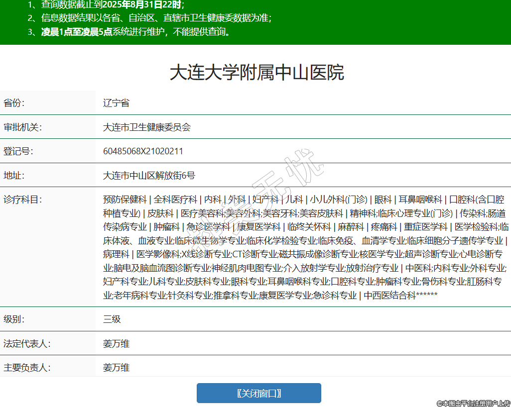 省份:遼寧省審批機關(guān):大連市衛(wèi)生健康委員會登記號:60485068X21020211地址:大連市中山區(qū)解放街6號診療科目:預(yù)防保健科 | 全科醫(yī)療科 | 內(nèi)科 | 外科 | 婦產(chǎn)科 | 兒科 | 小兒外科(門診) | 眼科 | 耳鼻咽喉科 | 口腔科(含口腔種植專業(yè)) | 皮膚科 | 醫(yī)療美容科;美容外科;美容牙科;美容皮膚科 | 精神科;臨床心理專業(yè)(門診) | 傳染科;腸道傳染病專業(yè) | 腫瘤科 | 急診醫(yī)學(xué)科 | 康復(fù)醫(yī)學(xué)科 | 臨終關(guān)懷科 | 麻醉科 | 疼痛科 | 重癥醫(yī)學(xué)科 | 醫(yī)學(xué)檢驗科;臨床體液、血液專業(yè);臨床微生物學(xué)專業(yè);臨床化學(xué)檢驗專業(yè);臨床免疫、血清學(xué)專業(yè);臨床細胞分子遺傳學(xué)專業(yè) | 病理科 | 醫(yī)學(xué)影像科;X線診斷專業(yè);CT診斷專業(yè);磁共振成像診斷專業(yè);核醫(yī)學(xué)專業(yè);超聲診斷專業(yè);心電診斷專業(yè);腦電及腦血流圖診斷專業(yè);神經(jīng)肌肉電圖專業(yè);介入放射學(xué)專業(yè);放射治療專業(yè) | 中醫(yī)科;內(nèi)科專業(yè);外科專業(yè);婦產(chǎn)科專業(yè);兒科專業(yè);皮膚科專業(yè);眼科專業(yè);耳鼻咽喉科專業(yè);口腔科專業(yè);腫瘤科專業(yè);骨傷科專業(yè);肛腸科專業(yè);老年病科專業(yè);針灸科專業(yè);推拿科專業(yè);康復(fù)醫(yī)學(xué)專業(yè);急診科專業(yè) | 中西醫(yī)結(jié)合科******級別:三級法定代表人:姜萬維主要負責(zé)人:姜萬維執(zhí)業(yè)許可證有效期:2017/10/23 -至- 2032/10/22 -