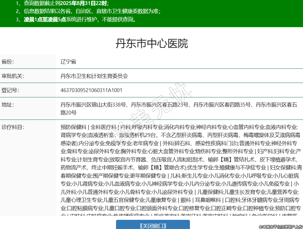 省份:遼寧省審批機(jī)關(guān):丹東市衛(wèi)生和計(jì)劃生育委員會登記號:46370309521060311A1001地址:丹東市振興區(qū)錦山大街338號、丹東市振興區(qū)春五路23號、丹東市振興區(qū)春四路35號、丹東市振興區(qū)春五路20號診療科目:預(yù)防保健科 | 全科醫(yī)療科 | 內(nèi)科;呼吸內(nèi)科專業(yè);消化內(nèi)科專業(yè);神經(jīng)內(nèi)科專業(yè);心血管內(nèi)科專業(yè);血液內(nèi)科專業(yè);腎病學(xué)專業(yè)(血液透析室:血液透析機(jī)29臺,不含乙型肝炎病毒、丙型肝炎病毒、梅毒螺旋體及艾滋病病毒感染者);內(nèi)分泌專業(yè);免疫學(xué)專業(yè);老年病專業(yè) | 外科(碎石科、感染性疾病科門診);普通外科專業(yè);神經(jīng)外科專業(yè);骨科專業(yè);泌尿外科專業(yè);胸外科專業(yè);心臟大血管外科專業(yè);燒傷科專業(yè);整形外科專業(yè) | 婦產(chǎn)科;婦科專業(yè);產(chǎn)科專業(yè);計(jì)劃生育專業(yè)(放取宮內(nèi)節(jié)育器、負(fù)壓吸宮人流和鉗刮術(shù)、輸卵【精】管結(jié)扎術(shù)、皮下埋植避孕術(shù)、藥物流產(chǎn)術(shù)、終止中期妊娠手術(shù)、輸卵【精】管吻合術(shù));優(yōu)生學(xué)專業(yè);生殖健康與不孕癥專業(yè) | 婦女保健科;青春期保健專業(yè);圍產(chǎn)期保健專業(yè);更年期保健專業(yè) | 兒科;新生兒專業(yè);小兒消化專業(yè);小兒呼吸專業(yè);小兒心臟病專業(yè);小兒腎病專業(yè);小兒血液病專業(yè);小兒神經(jīng)病學(xué)專業(yè);小兒內(nèi)分泌專業(yè);小兒遺傳病專業(yè);小兒免疫專業(yè) | 小兒外科;小兒普通外科專業(yè);小兒骨科專業(yè);小兒泌尿外科專業(yè) | 兒童保健科;兒童生長發(fā)育專業(yè);兒童營養(yǎng)專業(yè);兒童心理衛(wèi)生專業(yè);兒童五官保健專業(yè);兒童康復(fù)專業(yè) | 眼科 | 耳鼻咽喉科 | 口腔科;牙體牙髓病專業(yè);牙周病專業(yè);口腔粘膜病專業(yè);兒童口腔專業(yè);口腔頜面外科專業(yè);口腔修復(fù)專業(yè);口腔正畸專業(yè);口腔種植專業(yè);預(yù)防口腔專業(yè) | 皮膚科;皮膚病專業(yè);性傳播疾病專業(yè) | 醫(yī)療美容科;美容牙科;美容皮膚科 | 腫瘤科 | 急診醫(yī)學(xué)科 | 康復(fù)醫(yī)學(xué)科 | 麻醉科 | 疼痛科 | 重癥醫(yī)學(xué)科 | 醫(yī)學(xué)檢驗(yàn)科;臨床體液、血液專業(yè);臨床微生物學(xué)專業(yè);臨床化學(xué)檢驗(yàn)專業(yè);臨床免疫、血清學(xué)專業(yè);臨床細(xì)胞分子遺傳學(xué)專業(yè) | 病理科 | 醫(yī)學(xué)影像科;X線診斷專業(yè);CT診斷專業(yè);磁共振成像診斷專業(yè);核醫(yī)學(xué)專業(yè)(僅限診斷);超聲診斷專業(yè);心電診斷專業(yè);腦電及腦血流圖診斷專業(yè);神經(jīng)肌肉電圖專業(yè);介入放射學(xué)專業(yè);放射治療專業(yè) | 中醫(yī)科;內(nèi)科專業(yè);婦產(chǎn)科專業(yè);兒科專業(yè);口腔科專業(yè);針灸科專業(yè);推拿科專業(yè);康復(fù)醫(yī)學(xué)專業(yè)******級別:三級法定代表人:邢偉主要負(fù)責(zé)人:邢偉執(zhí)業(yè)許可證有效期:2011/03/01 -至- 2026/02/28 -