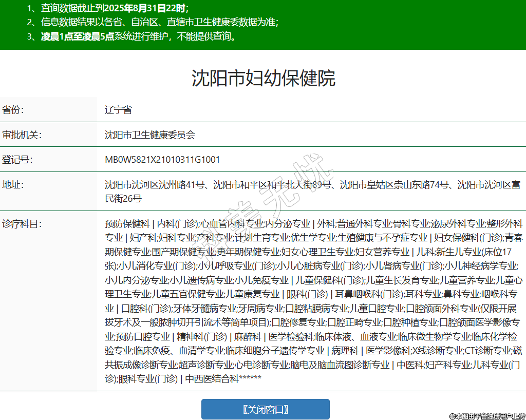 省份:遼寧省審批機關(guān):沈陽市衛(wèi)生健康委員會登記號:MB0W5821X21010311G1001地址:沈陽市沈河區(qū)沈州路41號、沈陽市和平區(qū)和平北大街89號、沈陽市皇姑區(qū)崇山東路74號、沈陽市沈河區(qū)富民街26號診療科目:預(yù)防保健科 | 內(nèi)科(門診);心血管內(nèi)科專業(yè);內(nèi)分泌專業(yè) | 外科;普通外科專業(yè);骨科專業(yè);泌尿外科專業(yè);整形外科專業(yè) | 婦產(chǎn)科;婦科專業(yè);產(chǎn)科專業(yè);計劃生育專業(yè);優(yōu)生學(xué)專業(yè);生殖健康與不孕癥專業(yè) | 婦女保健科(門診);青春期保健專業(yè);圍產(chǎn)期保健專業(yè);更年期保健專業(yè);婦女心理衛(wèi)生專業(yè);婦女營養(yǎng)專業(yè) | 兒科;新生兒專業(yè)(床位17張);小兒消化專業(yè)(門診);小兒呼吸專業(yè)(門診);小兒心臟病專業(yè)(門診);小兒腎病專業(yè)(門診);小兒神經(jīng)病學(xué)專業(yè);小兒內(nèi)分泌專業(yè);小兒遺傳病專業(yè);小兒免疫專業(yè) | 兒童保健科(門診);兒童生長發(fā)育專業(yè);兒童營養(yǎng)專業(yè);兒童心理衛(wèi)生專業(yè);兒童五官保健專業(yè);兒童康復(fù)專業(yè) | 眼科(門診) | 耳鼻咽喉科(門診);耳科專業(yè);鼻科專業(yè);咽喉科專業(yè) | 口腔科(門診);牙體牙髓病專業(yè);牙周病專業(yè);口腔粘膜病專業(yè);兒童口腔專業(yè);口腔頜面外科專業(yè)(僅限開展拔牙術(shù)及一般膿腫切開引流術(shù)等簡單項目);口腔修復(fù)專業(yè);口腔正畸專業(yè);口腔種植專業(yè);口腔頜面醫(yī)學(xué)影像專業(yè);預(yù)防口腔專業(yè) | 精神科(門診) | 麻醉科 | 醫(yī)學(xué)檢驗科;臨床體液、血液專業(yè);臨床微生物學(xué)專業(yè);臨床化學(xué)檢驗專業(yè);臨床免疫、血清學(xué)專業(yè);臨床細胞分子遺傳學(xué)專業(yè) | 病理科 | 醫(yī)學(xué)影像科;X線診斷專業(yè);CT診斷專業(yè);磁共振成像診斷專業(yè);超聲診斷專業(yè);心電診斷專業(yè);腦電及腦血流圖診斷專業(yè) | 中醫(yī)科;婦產(chǎn)科專業(yè);兒科專業(yè)(門診);眼科專業(yè)(門診) | 中西醫(yī)結(jié)合科******級別:三級法定代表人:李晨陽主要負責(zé)人:李晨陽執(zhí)業(yè)許可證有效期:2023/11/01 -至- 2030/05/31 -