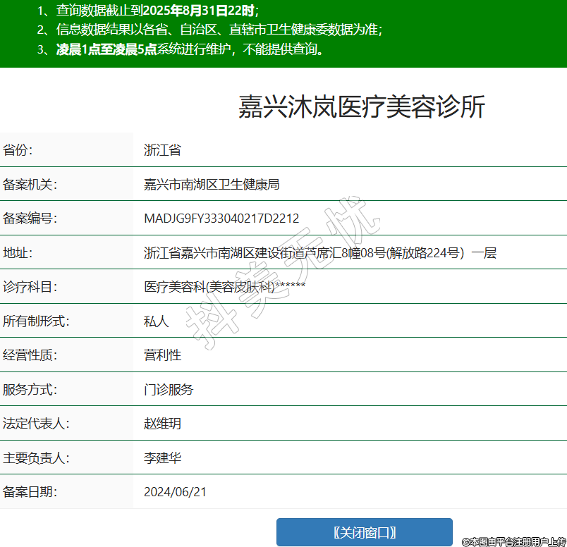 省份:浙江省備案機(jī)關(guān):嘉興市南湖區(qū)衛(wèi)生健康局備案編號(hào):MADJG9FY333040217D2212地址:浙江省嘉興市南湖區(qū)建設(shè)街道蘆席匯8幢08號(hào)(解放路224號(hào))一層診療科目:醫(yī)療美容科(美容皮膚科)******所有制形式:私人經(jīng)營(yíng)性質(zhì):營(yíng)利性服務(wù)方式:門診服務(wù)法定代表人:趙維玥主要負(fù)責(zé)人:李建華備案日期:2024/06/21 -