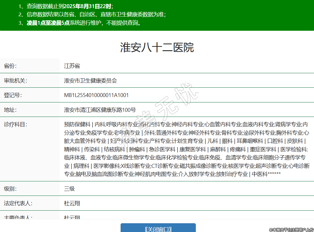 省份:江蘇省審批機關:淮安市衛(wèi)生健康委員會登記號:MB1L2554010000011A1001地址:淮安市清江浦區(qū)健康東路100號診療科目:預防保健科 | 內科;呼吸內科專業(yè);消化內科專業(yè);神經內科專業(yè);心血管內科專業(yè);血液內科專業(yè);腎病學專業(yè);內分泌專業(yè);免疫學專業(yè);老年病專業(yè) | 外科;普通外科專業(yè);神經外科專業(yè);骨科專業(yè);泌尿外科專業(yè);胸外科專業(yè);心臟大血管外科專業(yè) | 婦產科;婦科專業(yè);產科專業(yè);計劃生育專業(yè) | 兒科 | 眼科 | 耳鼻咽喉科 | 口腔科 | 皮膚科 | 精神科 | 傳染科 | 結核病科 | 腫瘤科 | 急診醫(yī)學科 | 康復醫(yī)學科 | 麻醉科 | 疼痛科 | 重癥醫(yī)學科 | 醫(yī)學檢驗科;臨床體液、血液專業(yè);臨床微生物學專業(yè);臨床化學檢驗專業(yè);臨床免疫、血清學專業(yè);臨床細胞分子遺傳學專業(yè) | 病理科 | 醫(yī)學影像科;X線診斷專業(yè);CT診斷專業(yè);磁共振成像診斷專業(yè);核醫(yī)學專業(yè);超聲診斷專業(yè);心電診斷專業(yè);腦電及腦血流圖診斷專業(yè);神經肌肉電圖專業(yè);介入放射學專業(yè);放射治療專業(yè) | 中醫(yī)科******級別:三級法定代表人:杜云翔主要負責人:杜云翔執(zhí)業(yè)許可證有效期:2025/04/01 -至- 2038/03/05 -