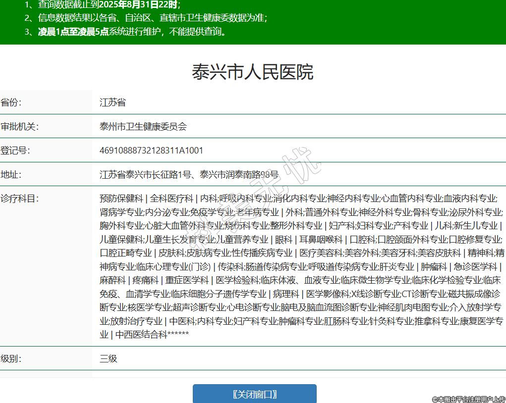 省份:江蘇省審批機(jī)關(guān):泰州市衛(wèi)生健康委員會登記號:46910888732128311A1001地址:江蘇省泰興市長征路1號、泰興市潤泰南路98號診療科目:預(yù)防保健科 | 全科醫(yī)療科 | 內(nèi)科;呼吸內(nèi)科專業(yè);消化內(nèi)科專業(yè);神經(jīng)內(nèi)科專業(yè);心血管內(nèi)科專業(yè);血液內(nèi)科專業(yè);腎病學(xué)專業(yè);內(nèi)分泌專業(yè);免疫學(xué)專業(yè);老年病專業(yè) | 外科;普通外科專業(yè);神經(jīng)外科專業(yè);骨科專業(yè);泌尿外科專業(yè);胸外科專業(yè);心臟大血管外科專業(yè);燒傷科專業(yè);整形外科專業(yè) | 婦產(chǎn)科;婦科專業(yè);產(chǎn)科專業(yè) | 兒科;新生兒專業(yè) | 兒童保健科;兒童生長發(fā)育專業(yè);兒童營養(yǎng)專業(yè) | 眼科 | 耳鼻咽喉科 | 口腔科;口腔頜面外科專業(yè);口腔修復(fù)專業(yè);口腔正畸專業(yè) | 皮膚科;皮膚病專業(yè);性傳播疾病專業(yè) | 醫(yī)療美容科;美容外科;美容牙科;美容皮膚科 | 精神科;精神病專業(yè);臨床心理專業(yè)(門診) | 傳染科;腸道傳染病專業(yè);呼吸道傳染病專業(yè);肝炎專業(yè) | 腫瘤科 | 急診醫(yī)學(xué)科 | 麻醉科 | 疼痛科 | 重癥醫(yī)學(xué)科 | 醫(yī)學(xué)檢驗(yàn)科;臨床體液、血液專業(yè);臨床微生物學(xué)專業(yè);臨床化學(xué)檢驗(yàn)專業(yè);臨床免疫、血清學(xué)專業(yè);臨床細(xì)胞分子遺傳學(xué)專業(yè) | 病理科 | 醫(yī)學(xué)影像科;X線診斷專業(yè);CT診斷專業(yè);磁共振成像診斷專業(yè);核醫(yī)學(xué)專業(yè);超聲診斷專業(yè);心電診斷專業(yè);腦電及腦血流圖診斷專業(yè);神經(jīng)肌肉電圖專業(yè);介入放射學(xué)專業(yè);放射治療專業(yè) | 中醫(yī)科;內(nèi)科專業(yè);婦產(chǎn)科專業(yè);腫瘤科專業(yè);肛腸科專業(yè);針灸科專業(yè);推拿科專業(yè);康復(fù)醫(yī)學(xué)專業(yè) | 中西醫(yī)結(jié)合科******級別:三級法定代表人:李文江主要負(fù)責(zé)人:李文江執(zhí)業(yè)許可證有效期:2021/03/31 -至- 2036/03/30 -