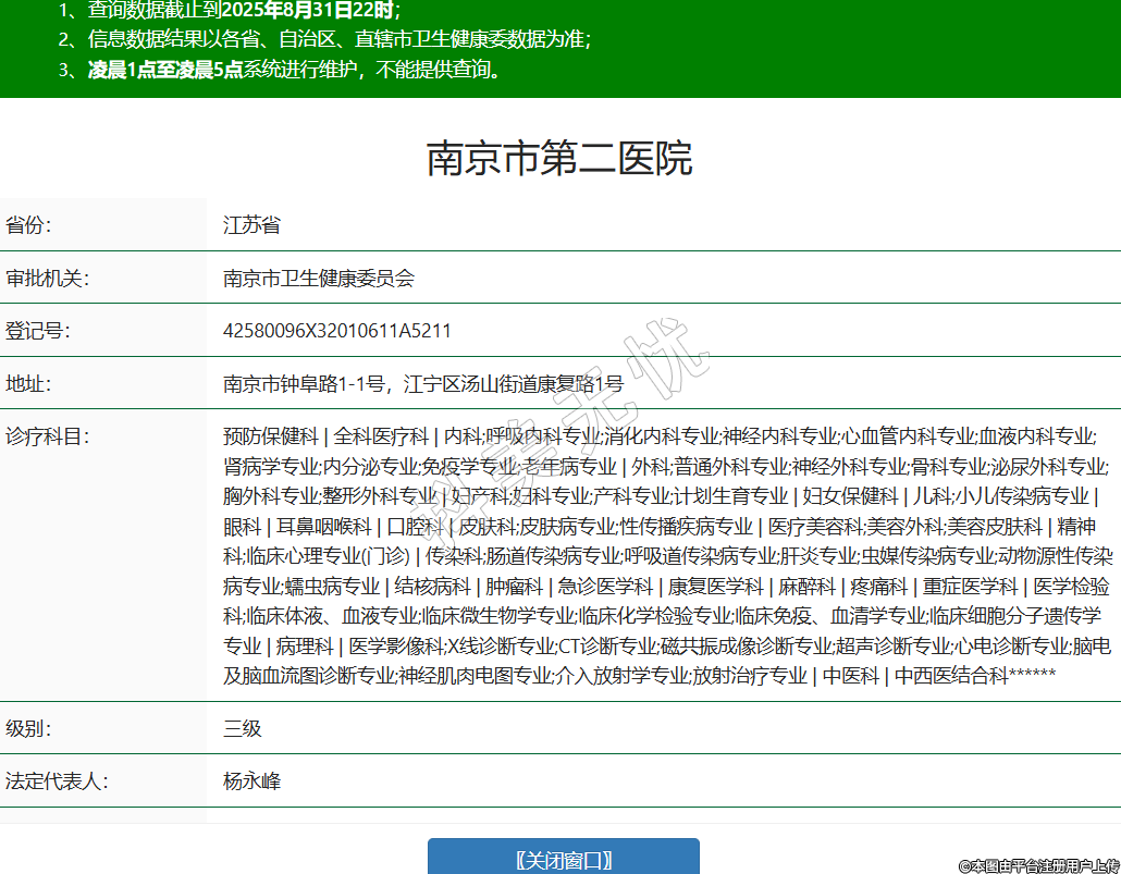 省份:江蘇省審批機(jī)關(guān):南京市衛(wèi)生健康委員會(huì)登記號(hào):42580096X32010611A5211地址:南京市鐘阜路1-1號(hào),江寧區(qū)湯山街道康復(fù)路1號(hào)診療科目:預(yù)防保健科 | 全科醫(yī)療科 | 內(nèi)科;呼吸內(nèi)科專業(yè);消化內(nèi)科專業(yè);神經(jīng)內(nèi)科專業(yè);心血管內(nèi)科專業(yè);血液內(nèi)科專業(yè);腎病學(xué)專業(yè);內(nèi)分泌專業(yè);免疫學(xué)專業(yè);老年病專業(yè) | 外科;普通外科專業(yè);神經(jīng)外科專業(yè);骨科專業(yè);泌尿外科專業(yè);胸外科專業(yè);整形外科專業(yè) | 婦產(chǎn)科;婦科專業(yè);產(chǎn)科專業(yè);計(jì)劃生育專業(yè) | 婦女保健科 | 兒科;小兒傳染病專業(yè) | 眼科 | 耳鼻咽喉科 | 口腔科 | 皮膚科;皮膚病專業(yè);性傳播疾病專業(yè) | 醫(yī)療美容科;美容外科;美容皮膚科 | 精神科;臨床心理專業(yè)(門診) | 傳染科;腸道傳染病專業(yè);呼吸道傳染病專業(yè);肝炎專業(yè);蟲媒傳染病專業(yè);動(dòng)物源性傳染病專業(yè);蠕蟲病專業(yè) | 結(jié)核病科 | 腫瘤科 | 急診醫(yī)學(xué)科 | 康復(fù)醫(yī)學(xué)科 | 麻醉科 | 疼痛科 | 重癥醫(yī)學(xué)科 | 醫(yī)學(xué)檢驗(yàn)科;臨床體液、血液專業(yè);臨床微生物學(xué)專業(yè);臨床化學(xué)檢驗(yàn)專業(yè);臨床免疫、血清學(xué)專業(yè);臨床細(xì)胞分子遺傳學(xué)專業(yè) | 病理科 | 醫(yī)學(xué)影像科;X線診斷專業(yè);CT診斷專業(yè);磁共振成像診斷專業(yè);超聲診斷專業(yè);心電診斷專業(yè);腦電及腦血流圖診斷專業(yè);神經(jīng)肌肉電圖專業(yè);介入放射學(xué)專業(yè);放射治療專業(yè) | 中醫(yī)科 | 中西醫(yī)結(jié)合科******級(jí)別:三級(jí)法定代表人:楊永峰主要負(fù)責(zé)人:楊永峰執(zhí)業(yè)許可證有效期:2025/04/17 -至- 2035/09/22 -