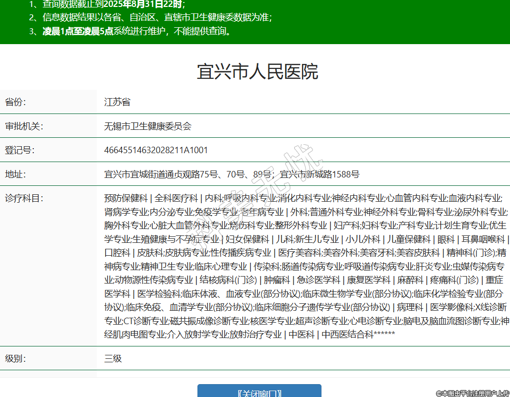 省份:江蘇省審批機關(guān):無錫市衛(wèi)生健康委員會登記號:46645514632028211A1001地址:宜興市宜城街道通貞觀路75號、70號、89號;宜興市新城路1588號診療科目:預(yù)防保健科 | 全科醫(yī)療科 | 內(nèi)科;呼吸內(nèi)科專業(yè);消化內(nèi)科專業(yè);神經(jīng)內(nèi)科專業(yè);心血管內(nèi)科專業(yè);血液內(nèi)科專業(yè);腎病學(xué)專業(yè);內(nèi)分泌專業(yè);免疫學(xué)專業(yè);老年病專業(yè) | 外科;普通外科專業(yè);神經(jīng)外科專業(yè);骨科專業(yè);泌尿外科專業(yè);胸外科專業(yè);心臟大血管外科專業(yè);燒傷科專業(yè);整形外科專業(yè) | 婦產(chǎn)科;婦科專業(yè);產(chǎn)科專業(yè);計劃生育專業(yè);優(yōu)生學(xué)專業(yè);生殖健康與不孕癥專業(yè) | 婦女保健科 | 兒科;新生兒專業(yè) | 小兒外科 | 兒童保健科 | 眼科 | 耳鼻咽喉科 | 口腔科 | 皮膚科;皮膚病專業(yè);性傳播疾病專業(yè) | 醫(yī)療美容科;美容外科;美容牙科;美容皮膚科 | 精神科(門診);精神病專業(yè);精神衛(wèi)生專業(yè);臨床心理專業(yè) | 傳染科;腸道傳染病專業(yè);呼吸道傳染病專業(yè);肝炎專業(yè);蟲媒傳染病專業(yè);動物源性傳染病專業(yè) | 結(jié)核病科(門診) | 腫瘤科 | 急診醫(yī)學(xué)科 | 康復(fù)醫(yī)學(xué)科 | 麻醉科 | 疼痛科(門診) | 重癥醫(yī)學(xué)科 | 醫(yī)學(xué)檢驗科;臨床體液、血液專業(yè)(部分協(xié)議);臨床微生物學(xué)專業(yè)(部分協(xié)議);臨床化學(xué)檢驗專業(yè)(部分協(xié)議);臨床免疫、血清學(xué)專業(yè)(部分協(xié)議);臨床細胞分子遺傳學(xué)專業(yè)(部分協(xié)議) | 病理科 | 醫(yī)學(xué)影像科;X線診斷專業(yè);CT診斷專業(yè);磁共振成像診斷專業(yè);核醫(yī)學(xué)專業(yè);超聲診斷專業(yè);心電診斷專業(yè);腦電及腦血流圖診斷專業(yè);神經(jīng)肌肉電圖專業(yè);介入放射學(xué)專業(yè);放射治療專業(yè) | 中醫(yī)科 | 中西醫(yī)結(jié)合科******級別:三級法定代表人:吳俊東主要負責人:吳俊東執(zhí)業(yè)許可證有效期:2021/12/19 -至- 2036/12/18 -