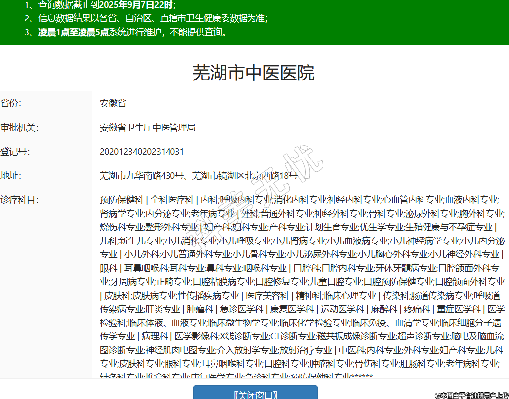 省份:安徽省審批機(jī)關(guān):安徽省衛(wèi)生廳中醫(yī)管理局登記號:202012340202314031地址:蕪湖市九華南路430號、蕪湖市鏡湖區(qū)北京西路18號診療科目:預(yù)防保健科 | 全科醫(yī)療科 | 內(nèi)科;呼吸內(nèi)科專業(yè);消化內(nèi)科專業(yè);神經(jīng)內(nèi)科專業(yè);心血管內(nèi)科專業(yè);血液內(nèi)科專業(yè);腎病學(xué)專業(yè);內(nèi)分泌專業(yè);老年病專業(yè) | 外科;普通外科專業(yè);神經(jīng)外科專業(yè);骨科專業(yè);泌尿外科專業(yè);胸外科專業(yè);燒傷科專業(yè);整形外科專業(yè) | 婦產(chǎn)科;婦科專業(yè);產(chǎn)科專業(yè);計(jì)劃生育專業(yè);優(yōu)生學(xué)專業(yè);生殖健康與不孕癥專業(yè) | 兒科;新生兒專業(yè);小兒消化專業(yè);小兒呼吸專業(yè);小兒腎病專業(yè);小兒血液病專業(yè);小兒神經(jīng)病學(xué)專業(yè);小兒內(nèi)分泌專業(yè) | 小兒外科;小兒普通外科專業(yè);小兒骨科專業(yè);小兒泌尿外科專業(yè);小兒胸心外科專業(yè);小兒神經(jīng)外科專業(yè) | 眼科 | 耳鼻咽喉科;耳科專業(yè);鼻科專業(yè);咽喉科專業(yè) | 口腔科;口腔內(nèi)科專業(yè);牙體牙髓病專業(yè);口腔頜面外科專業(yè);牙周病專業(yè);正畸專業(yè);口腔粘膜病專業(yè);口腔修復(fù)專業(yè);兒童口腔專業(yè);口腔預(yù)防保健專業(yè);口腔頜面外科專業(yè) | 皮膚科;皮膚病專業(yè);性傳播疾病專業(yè) | 醫(yī)療美容科 | 精神科;臨床心理專業(yè) | 傳染科;腸道傳染病專業(yè);呼吸道傳染病專業(yè);肝炎專業(yè) | 腫瘤科 | 急診醫(yī)學(xué)科 | 康復(fù)醫(yī)學(xué)科 | 運(yùn)動醫(yī)學(xué)科 | 麻醉科 | 疼痛科 | 重癥醫(yī)學(xué)科 | 醫(yī)學(xué)檢驗(yàn)科;臨床體液、血液專業(yè);臨床微生物學(xué)專業(yè);臨床化學(xué)檢驗(yàn)專業(yè);臨床免疫、血清學(xué)專業(yè);臨床細(xì)胞分子遺傳學(xué)專業(yè) | 病理科 | 醫(yī)學(xué)影像科;X線診斷專業(yè);CT診斷專業(yè);磁共振成像診斷專業(yè);超聲診斷專業(yè);腦電及腦血流圖診斷專業(yè);神經(jīng)肌肉電圖專業(yè);介入放射學(xué)專業(yè);放射治療專業(yè) | 中醫(yī)科;內(nèi)科專業(yè);外科專業(yè);婦產(chǎn)科專業(yè);兒科專業(yè);皮膚科專業(yè);眼科專業(yè);耳鼻咽喉科專業(yè);口腔科專業(yè);腫瘤科專業(yè);骨傷科專業(yè);肛腸科專業(yè);老年病科專業(yè);針灸科專業(yè);推拿科專業(yè);康復(fù)醫(yī)學(xué)專業(yè);急診科專業(yè);預(yù)防保健科專業(yè)******級別:三級法定代表人:劉昌闊主要負(fù)責(zé)人:劉昌闊執(zhí)業(yè)許可證有效期:2016/12/20 -至- 2031/11/30 -