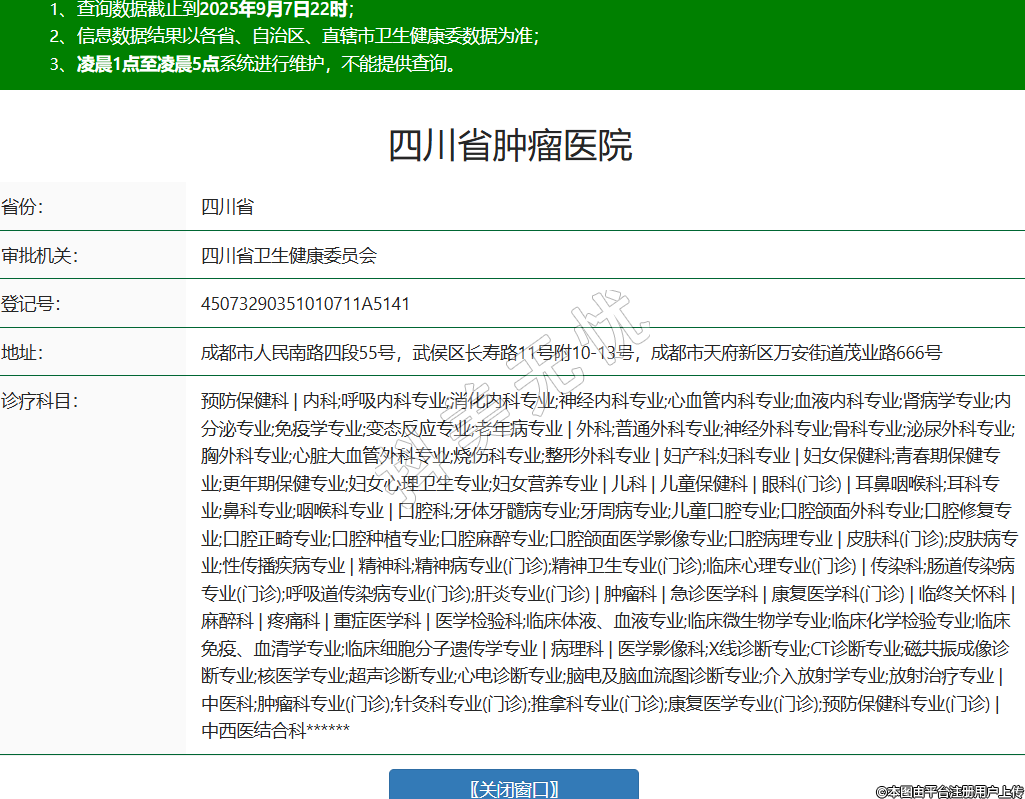 省份:四川省審批機(jī)關(guān):四川省衛(wèi)生健康委員會(huì)登記號(hào):45073290351010711A5141地址:成都市人民南路四段55號(hào),武侯區(qū)長(zhǎng)壽路11號(hào)附10-13號(hào),成都市天府新區(qū)萬安街道茂業(yè)路666號(hào)診療科目:預(yù)防保健科 | 內(nèi)科;呼吸內(nèi)科專業(yè);消化內(nèi)科專業(yè);神經(jīng)內(nèi)科專業(yè);心血管內(nèi)科專業(yè);血液內(nèi)科專業(yè);腎病學(xué)專業(yè);內(nèi)分泌專業(yè);免疫學(xué)專業(yè);變態(tài)反應(yīng)專業(yè);老年病專業(yè) | 外科;普通外科專業(yè);神經(jīng)外科專業(yè);骨科專業(yè);泌尿外科專業(yè);胸外科專業(yè);心臟大血管外科專業(yè);燒傷科專業(yè);整形外科專業(yè) | 婦產(chǎn)科;婦科專業(yè) | 婦女保健科;青春期保健專業(yè);更年期保健專業(yè);婦女心理衛(wèi)生專業(yè);婦女營(yíng)養(yǎng)專業(yè) | 兒科 | 兒童保健科 | 眼科(門診) | 耳鼻咽喉科;耳科專業(yè);鼻科專業(yè);咽喉科專業(yè) | 口腔科;牙體牙髓病專業(yè);牙周病專業(yè);兒童口腔專業(yè);口腔頜面外科專業(yè);口腔修復(fù)專業(yè);口腔正畸專業(yè);口腔種植專業(yè);口腔麻醉專業(yè);口腔頜面醫(yī)學(xué)影像專業(yè);口腔病理專業(yè) | 皮膚科(門診);皮膚病專業(yè);性傳播疾病專業(yè) | 精神科;精神病專業(yè)(門診);精神衛(wèi)生專業(yè)(門診);臨床心理專業(yè)(門診) | 傳染科;腸道傳染病專業(yè)(門診);呼吸道傳染病專業(yè)(門診);肝炎專業(yè)(門診) | 腫瘤科 | 急診醫(yī)學(xué)科 | 康復(fù)醫(yī)學(xué)科(門診) | 臨終關(guān)懷科 | 麻醉科 | 疼痛科 | 重癥醫(yī)學(xué)科 | 醫(yī)學(xué)檢驗(yàn)科;臨床體液、血液專業(yè);臨床微生物學(xué)專業(yè);臨床化學(xué)檢驗(yàn)專業(yè);臨床免疫、血清學(xué)專業(yè);臨床細(xì)胞分子遺傳學(xué)專業(yè) | 病理科 | 醫(yī)學(xué)影像科;X線診斷專業(yè);CT診斷專業(yè);磁共振成像診斷專業(yè);核醫(yī)學(xué)專業(yè);超聲診斷專業(yè);心電診斷專業(yè);腦電及腦血流圖診斷專業(yè);介入放射學(xué)專業(yè);放射治療專業(yè) | 中醫(yī)科;腫瘤科專業(yè)(門診);針灸科專業(yè)(門診);推拿科專業(yè)(門診);康復(fù)醫(yī)學(xué)專業(yè)(門診);預(yù)防保健科專業(yè)(門診) | 中西醫(yī)結(jié)合科******級(jí)別:三級(jí)法定代表人:林桐榆主要負(fù)責(zé)人:林桐榆執(zhí)業(yè)許可證有效期:2022/01/01 -至- 2036/12/31 -