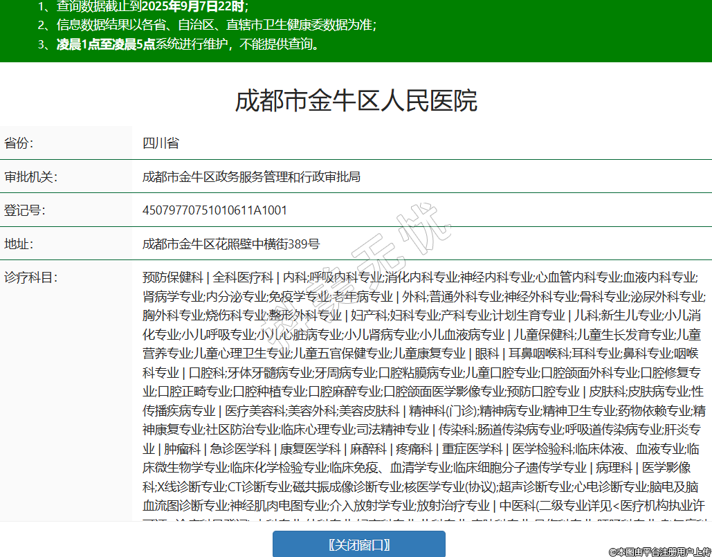 省份:四川省審批機關:成都市金牛區(qū)政務服務管理和行政審批局登記號:45079770751010611A1001地址:成都市金牛區(qū)花照壁中橫街389號診療科目:預防保健科 | 全科醫(yī)療科 | 內科;呼吸內科專業(yè);消化內科專業(yè);神經內科專業(yè);心血管內科專業(yè);血液內科專業(yè);腎病學專業(yè);內分泌專業(yè);免疫學專業(yè);老年病專業(yè) | 外科;普通外科專業(yè);神經外科專業(yè);骨科專業(yè);泌尿外科專業(yè);胸外科專業(yè);燒傷科專業(yè);整形外科專業(yè) | 婦產科;婦科專業(yè);產科專業(yè);計劃生育專業(yè) | 兒科;新生兒專業(yè);小兒消化專業(yè);小兒呼吸專業(yè);小兒心臟病專業(yè);小兒腎病專業(yè);小兒血液病專業(yè) | 兒童保健科;兒童生長發(fā)育專業(yè);兒童營養(yǎng)專業(yè);兒童心理衛(wèi)生專業(yè);兒童五官保健專業(yè);兒童康復專業(yè) | 眼科 | 耳鼻咽喉科;耳科專業(yè);鼻科專業(yè);咽喉科專業(yè) | 口腔科;牙體牙髓病專業(yè);牙周病專業(yè);口腔粘膜病專業(yè);兒童口腔專業(yè);口腔頜面外科專業(yè);口腔修復專業(yè);口腔正畸專業(yè);口腔種植專業(yè);口腔麻醉專業(yè);口腔頜面醫(yī)學影像專業(yè);預防口腔專業(yè) | 皮膚科;皮膚病專業(yè);性傳播疾病專業(yè) | 醫(yī)療美容科;美容外科;美容皮膚科 | 精神科(門診);精神病專業(yè);精神衛(wèi)生專業(yè);藥物依賴專業(yè);精神康復專業(yè);社區(qū)防治專業(yè);臨床心理專業(yè);司法精神專業(yè) | 傳染科;腸道傳染病專業(yè);呼吸道傳染病專業(yè);肝炎專業(yè) | 腫瘤科 | 急診醫(yī)學科 | 康復醫(yī)學科 | 麻醉科 | 疼痛科 | 重癥醫(yī)學科 | 醫(yī)學檢驗科;臨床體液、血液專業(yè);臨床微生物學專業(yè);臨床化學檢驗專業(yè);臨床免疫、血清學專業(yè);臨床細胞分子遺傳學專業(yè) | 病理科 | 醫(yī)學影像科;X線診斷專業(yè);CT診斷專業(yè);磁共振成像診斷專業(yè);核醫(yī)學專業(yè)(協議);超聲診斷專業(yè);心電診斷專業(yè);腦電及腦血流圖診斷專業(yè);神經肌肉電圖專業(yè);介入放射學專業(yè);放射治療專業(yè) | 中醫(yī)科(二級專業(yè)詳見<醫(yī)療機構執(zhí)業(yè)許可證>診療科目登記);內科專業(yè);外科專業(yè);婦產科專業(yè);兒科專業(yè);皮膚科專業(yè);骨傷科專業(yè);肛腸科專業(yè);老年病科專業(yè);針灸科專業(yè);推拿科專業(yè);康復醫(yī)學專業(yè) | 中西醫(yī)結合科******級別:三級法定代表人:翁一文主要負責人: -