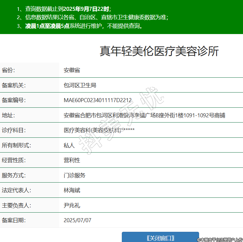 省份:安徽省備案機關(guān):包河區(qū)衛(wèi)生局備案編號:MAE60PC0234011117D2212地址:安徽省合肥市包河區(qū)利港銀河幸福廣場B座外街1樓1091-1092號商鋪診療科目:醫(yī)療美容科(美容皮膚科)******所有制形式:私人經(jīng)營性質(zhì):營利性服務(wù)方式:門診服務(wù)法定代表人:林海斌主要負(fù)責(zé)人:尹兆禮備案日期:2025/07/07 -
