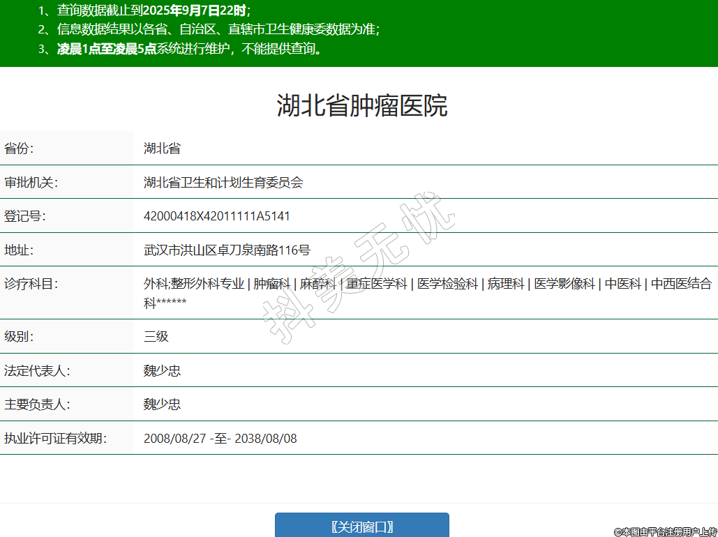 省份:湖北省審批機(jī)關(guān):湖北省衛(wèi)生和計(jì)劃生育委員會登記號:42000418X42011111A5141地址:武漢市洪山區(qū)卓刀泉南路116號診療科目:外科;整形外科專業(yè) | 腫瘤科 | 麻醉科 | 重癥醫(yī)學(xué)科 | 醫(yī)學(xué)檢驗(yàn)科 | 病理科 | 醫(yī)學(xué)影像科 | 中醫(yī)科 | 中西醫(yī)結(jié)合科******級別:三級法定代表人:魏少忠主要負(fù)責(zé)人:魏少忠執(zhí)業(yè)許可證有效期:2008/08/27 -至- 2038/08/08 -