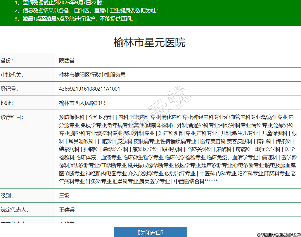 省份:陜西省審批機關:榆林市榆陽區(qū)行政審批服務局登記號:43669219161080211A1001地址:榆林市西人民路33號診療科目:預防保健科 | 全科醫(yī)療科 | 內科;呼吸內科專業(yè);消化內科專業(yè);神經內科專業(yè);心血管內科專業(yè);腎病學專業(yè);內分泌專業(yè);免疫學專業(yè);老年病專業(yè);其他(健康體檢科) | 外科;普通外科專業(yè);神經外科專業(yè);骨科專業(yè);泌尿外科專業(yè);胸外科專業(yè);燒傷科專業(yè);整形外科專業(yè) | 婦產科;婦科專業(yè);產科專業(yè) | 兒科;新生兒專業(yè) | 兒童保健科 | 眼科 | 耳鼻咽喉科 | 口腔科 | 皮膚科;皮膚病專業(yè);性傳播疾病專業(yè) | 醫(yī)療美容科;美容皮膚科 | 精神科 | 傳染科 | 結核病科 | 腫瘤科 | 急診醫(yī)學科 | 康復醫(yī)學科 | 職業(yè)病科 | 臨終關懷科 | 麻醉科 | 疼痛科 | 重癥醫(yī)學科 | 醫(yī)學檢驗科;臨床體液、血液專業(yè);臨床微生物學專業(yè);臨床化學檢驗專業(yè);臨床免疫、血清學專業(yè) | 病理科 | 醫(yī)學影像科;X線診斷專業(yè);CT診斷專業(yè);磁共振成像診斷專業(yè);核醫(yī)學專業(yè);超聲診斷專業(yè);心電診斷專業(yè);腦電及腦血流圖診斷專業(yè);神經肌肉電圖專業(yè);介入放射學專業(yè);放射治療專業(yè) | 中醫(yī)科;內科專業(yè);婦產科專業(yè);肛腸科專業(yè);老年病科專業(yè);針灸科專業(yè);推拿科專業(yè);康復醫(yī)學專業(yè) | 中西醫(yī)結合科******級別:三級法定代表人:王建睿主要負責人:王建睿執(zhí)業(yè)許可證有效期:2021/10/21 -至- 2026/10/20 -