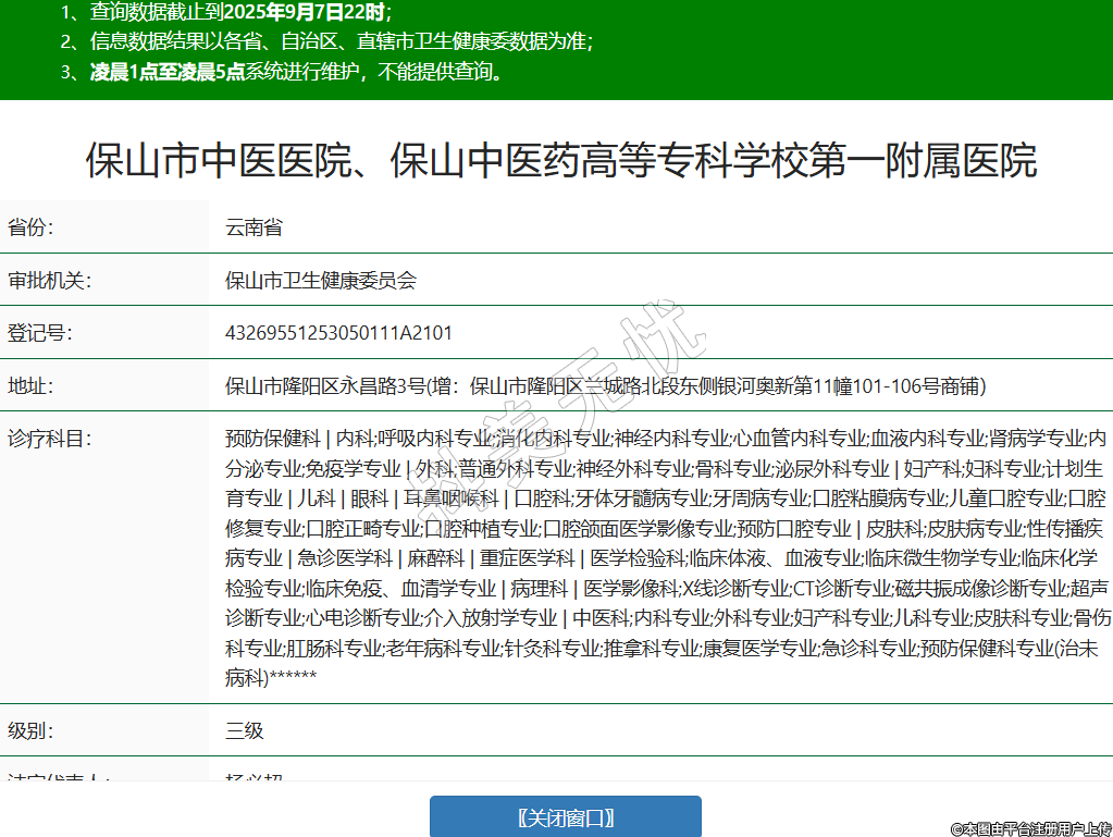 省份:云南省審批機關(guān):保山市衛(wèi)生健康委員會登記號:43269551253050111A2101地址:保山市隆陽區(qū)永昌路3號(增:保山市隆陽區(qū)蘭城路北段東側(cè)銀河奧新第11幢101-106號商鋪)診療科目:預(yù)防保健科 | 內(nèi)科;呼吸內(nèi)科專業(yè);消化內(nèi)科專業(yè);神經(jīng)內(nèi)科專業(yè);心血管內(nèi)科專業(yè);血液內(nèi)科專業(yè);腎病學(xué)專業(yè);內(nèi)分泌專業(yè);免疫學(xué)專業(yè) | 外科;普通外科專業(yè);神經(jīng)外科專業(yè);骨科專業(yè);泌尿外科專業(yè) | 婦產(chǎn)科;婦科專業(yè);計劃生育專業(yè) | 兒科 | 眼科 | 耳鼻咽喉科 | 口腔科;牙體牙髓病專業(yè);牙周病專業(yè);口腔粘膜病專業(yè);兒童口腔專業(yè);口腔修復(fù)專業(yè);口腔正畸專業(yè);口腔種植專業(yè);口腔頜面醫(yī)學(xué)影像專業(yè);預(yù)防口腔專業(yè) | 皮膚科;皮膚病專業(yè);性傳播疾病專業(yè) | 急診醫(yī)學(xué)科 | 麻醉科 | 重癥醫(yī)學(xué)科 | 醫(yī)學(xué)檢驗科;臨床體液、血液專業(yè);臨床微生物學(xué)專業(yè);臨床化學(xué)檢驗專業(yè);臨床免疫、血清學(xué)專業(yè) | 病理科 | 醫(yī)學(xué)影像科;X線診斷專業(yè);CT診斷專業(yè);磁共振成像診斷專業(yè);超聲診斷專業(yè);心電診斷專業(yè);介入放射學(xué)專業(yè) | 中醫(yī)科;內(nèi)科專業(yè);外科專業(yè);婦產(chǎn)科專業(yè);兒科專業(yè);皮膚科專業(yè);骨傷科專業(yè);肛腸科專業(yè);老年病科專業(yè);針灸科專業(yè);推拿科專業(yè);康復(fù)醫(yī)學(xué)專業(yè);急診科專業(yè);預(yù)防保健科專業(yè)(治未病科)******級別:三級法定代表人:楊必超主要負責(zé)人:楊必超執(zhí)業(yè)許可證有效期:2025/03/24 -至- 2040/03/23 -