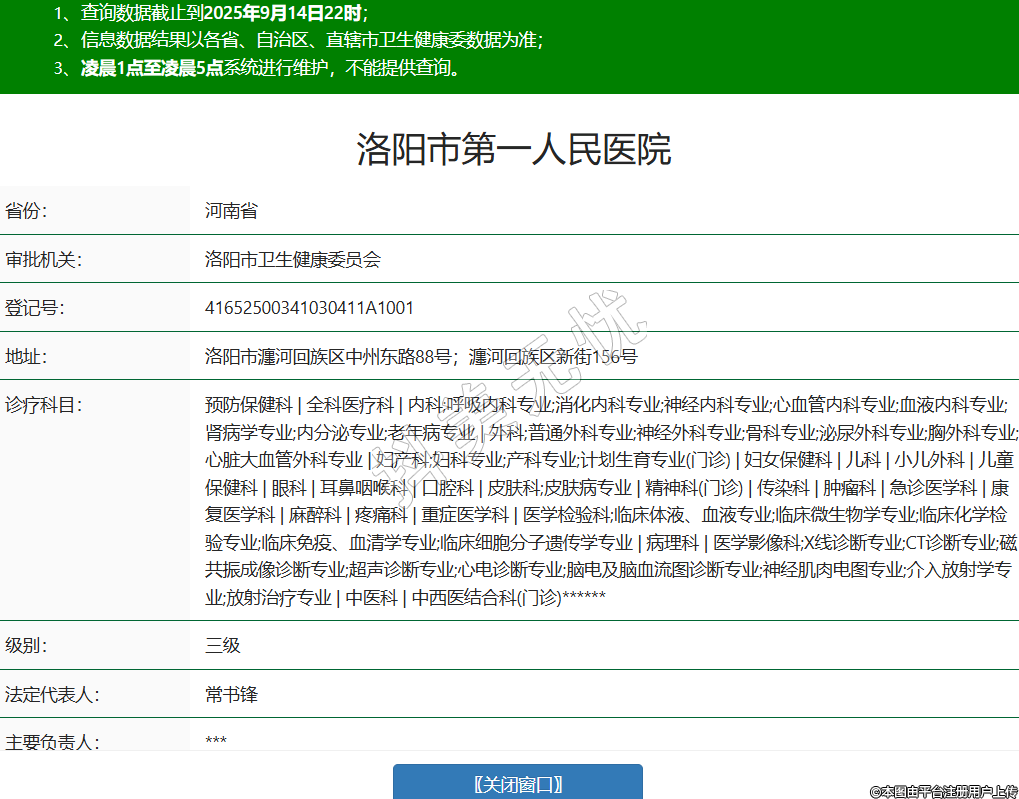 省份:河南省審批機關(guān):洛陽市衛(wèi)生健康委員會登記號:41652500341030411A1001地址:洛陽市瀍河回族區(qū)中州東路88號;瀍河回族區(qū)新街156號診療科目:預(yù)防保健科 | 全科醫(yī)療科 | 內(nèi)科;呼吸內(nèi)科專業(yè);消化內(nèi)科專業(yè);神經(jīng)內(nèi)科專業(yè);心血管內(nèi)科專業(yè);血液內(nèi)科專業(yè);腎病學(xué)專業(yè);內(nèi)分泌專業(yè);老年病專業(yè) | 外科;普通外科專業(yè);神經(jīng)外科專業(yè);骨科專業(yè);泌尿外科專業(yè);胸外科專業(yè);心臟大血管外科專業(yè) | 婦產(chǎn)科;婦科專業(yè);產(chǎn)科專業(yè);計劃生育專業(yè)(門診) | 婦女保健科 | 兒科 | 小兒外科 | 兒童保健科 | 眼科 | 耳鼻咽喉科 | 口腔科 | 皮膚科;皮膚病專業(yè) | 精神科(門診) | 傳染科 | 腫瘤科 | 急診醫(yī)學(xué)科 | 康復(fù)醫(yī)學(xué)科 | 麻醉科 | 疼痛科 | 重癥醫(yī)學(xué)科 | 醫(yī)學(xué)檢驗科;臨床體液、血液專業(yè);臨床微生物學(xué)專業(yè);臨床化學(xué)檢驗專業(yè);臨床免疫、血清學(xué)專業(yè);臨床細胞分子遺傳學(xué)專業(yè) | 病理科 | 醫(yī)學(xué)影像科;X線診斷專業(yè);CT診斷專業(yè);磁共振成像診斷專業(yè);超聲診斷專業(yè);心電診斷專業(yè);腦電及腦血流圖診斷專業(yè);神經(jīng)肌肉電圖專業(yè);介入放射學(xué)專業(yè);放射治療專業(yè) | 中醫(yī)科 | 中西醫(yī)結(jié)合科(門診)******級別:三級法定代表人:常書鋒主要負(fù)責(zé)人:***執(zhí)業(yè)許可證有效期:2025/08/11 -至- 2033/04/07 -