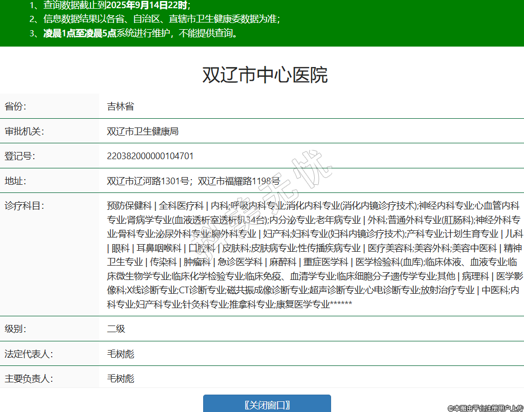 省份:吉林省審批機關:雙遼市衛(wèi)生健康局登記號:220382000000104701地址:雙遼市遼河路1301號;雙遼市福耀路1198號診療科目:預防保健科 | 全科醫(yī)療科 | 內科;呼吸內科專業(yè);消化內科專業(yè)(消化內鏡診療技術);神經(jīng)內科專業(yè);心血管內科專業(yè);腎病學專業(yè)(血液透析室透析機34臺);內分泌專業(yè);老年病專業(yè) | 外科;普通外科專業(yè)(肛腸科);神經(jīng)外科專業(yè);骨科專業(yè);泌尿外科專業(yè);胸外科專業(yè) | 婦產(chǎn)科;婦科專業(yè)(婦科內鏡診療技術);產(chǎn)科專業(yè);計劃生育專業(yè) | 兒科 | 眼科 | 耳鼻咽喉科 | 口腔科 | 皮膚科;皮膚病專業(yè);性傳播疾病專業(yè) | 醫(yī)療美容科;美容外科;美容中醫(yī)科 | 精神衛(wèi)生專業(yè) | 傳染科 | 腫瘤科 | 急診醫(yī)學科 | 麻醉科 | 重癥醫(yī)學科 | 醫(yī)學檢驗科(血庫);臨床體液、血液專業(yè);臨床微生物學專業(yè);臨床化學檢驗專業(yè);臨床免疫、血清學專業(yè);臨床細胞分子遺傳學專業(yè);其他 | 病理科 | 醫(yī)學影像科;X線診斷專業(yè);CT診斷專業(yè);磁共振成像診斷專業(yè);超聲診斷專業(yè);心電診斷專業(yè);放射治療專業(yè) | 中醫(yī)科;內科專業(yè);婦產(chǎn)科專業(yè);針灸科專業(yè);推拿科專業(yè);康復醫(yī)學專業(yè)******級別:二級法定代表人:毛樹彪主要負責人:毛樹彪執(zhí)業(yè)許可證有效期:2023/06/09 -至- 2026/06/09 -