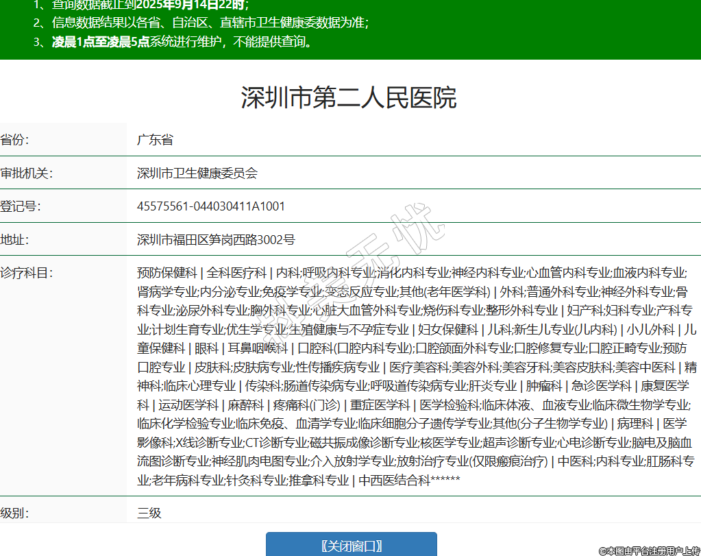 省份:廣東省審批機關:深圳市衛(wèi)生健康委員會登記號:45575561-044030411A1001地址:深圳市福田區(qū)筍崗西路3002號診療科目:預防保健科 | 全科醫(yī)療科 | 內科;呼吸內科專業(yè);消化內科專業(yè);神經內科專業(yè);心血管內科專業(yè);血液內科專業(yè);腎病學專業(yè);內分泌專業(yè);免疫學專業(yè);變態(tài)反應專業(yè);其他(老年醫(yī)學科) | 外科;普通外科專業(yè);神經外科專業(yè);骨科專業(yè);泌尿外科專業(yè);胸外科專業(yè);心臟大血管外科專業(yè);燒傷科專業(yè);整形外科專業(yè) | 婦產科;婦科專業(yè);產科專業(yè);計劃生育專業(yè);優(yōu)生學專業(yè);生殖健康與不孕癥專業(yè) | 婦女保健科 | 兒科;新生兒專業(yè)(兒內科) | 小兒外科 | 兒童保健科 | 眼科 | 耳鼻咽喉科 | 口腔科(口腔內科專業(yè));口腔頜面外科專業(yè);口腔修復專業(yè);口腔正畸專業(yè);預防口腔專業(yè) | 皮膚科;皮膚病專業(yè);性傳播疾病專業(yè) | 醫(yī)療美容科;美容外科;美容牙科;美容皮膚科;美容中醫(yī)科 | 精神科;臨床心理專業(yè) | 傳染科;腸道傳染病專業(yè);呼吸道傳染病專業(yè);肝炎專業(yè) | 腫瘤科 | 急診醫(yī)學科 | 康復醫(yī)學科 | 運動醫(yī)學科 | 麻醉科 | 疼痛科(門診) | 重癥醫(yī)學科 | 醫(yī)學檢驗科;臨床體液、血液專業(yè);臨床微生物學專業(yè);臨床化學檢驗專業(yè);臨床免疫、血清學專業(yè);臨床細胞分子遺傳學專業(yè);其他(分子生物學專業(yè)) | 病理科 | 醫(yī)學影像科;X線診斷專業(yè);CT診斷專業(yè);磁共振成像診斷專業(yè);核醫(yī)學專業(yè);超聲診斷專業(yè);心電診斷專業(yè);腦電及腦血流圖診斷專業(yè);神經肌肉電圖專業(yè);介入放射學專業(yè);放射治療專業(yè)(僅限瘢痕治療) | 中醫(yī)科;內科專業(yè);肛腸科專業(yè);老年病科專業(yè);針灸科專業(yè);推拿科專業(yè) | 中西醫(yī)結合科******級別:三級法定代表人:曾暉主要負責人:***執(zhí)業(yè)許可證有效期:2022/02/15 -至- 2037/02/14 -