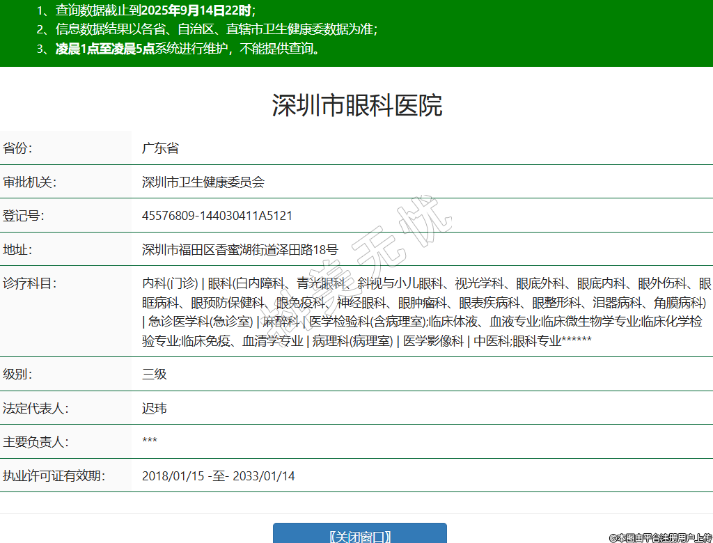 省份:廣東省審批機關:深圳市衛(wèi)生健康委員會登記號:45576809-144030411A5121地址:深圳市福田區(qū)香蜜湖街道澤田路18號診療科目:內(nèi)科(門診) | 眼科(白內(nèi)障科、青光眼科、斜視與小兒眼科、視光學科、眼底外科、眼底內(nèi)科、眼外傷科、眼眶病科、眼預防保健科、眼免疫科、神經(jīng)眼科、眼腫瘤科、眼表疾病科、眼整形科、淚器病科、角膜病科) | 急診醫(yī)學科(急診室) | 麻醉科 | 醫(yī)學檢驗科(含病理室);臨床體液、血液專業(yè);臨床微生物學專業(yè);臨床化學檢驗專業(yè);臨床免疫、血清學專業(yè) | 病理科(病理室) | 醫(yī)學影像科 | 中醫(yī)科;眼科專業(yè)******級別:三級法定代表人:遲瑋主要負責人:***執(zhí)業(yè)許可證有效期:2018/01/15 -至- 2033/01/14 -