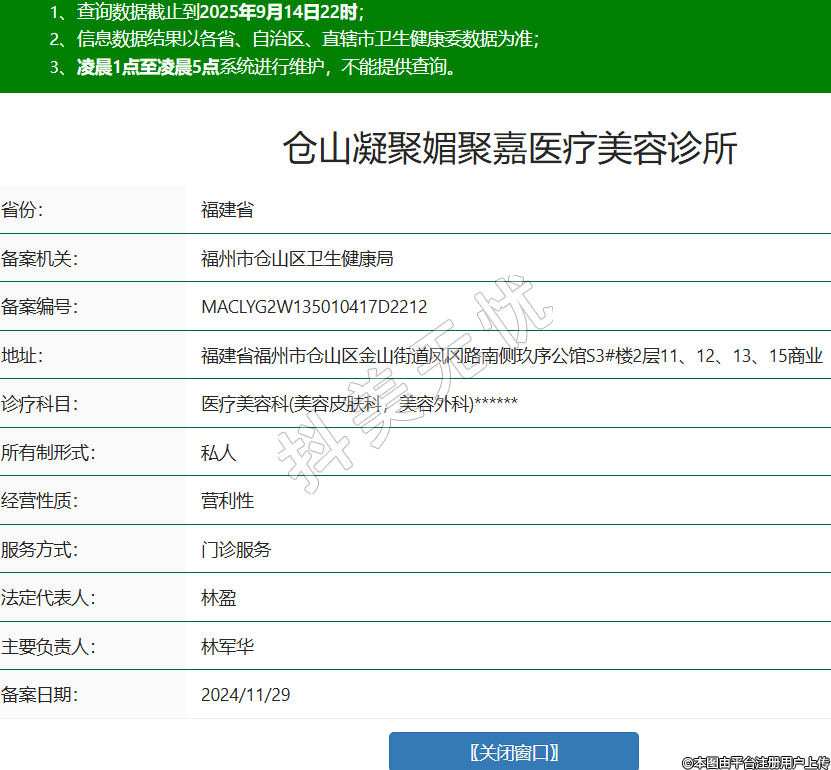 省份:福建省備案機(jī)關(guān):福州市倉山區(qū)衛(wèi)生健康局備案編號(hào):MACLYG2W135010417D2212地址:福建省福州市倉山區(qū)金山街道鳳岡路南側(cè)玖序公館S3#樓2層11、12、13、15商業(yè)診療科目:醫(yī)療美容科(美容皮膚科,美容外科)******所有制形式:私人經(jīng)營性質(zhì):營利性服務(wù)方式:門診服務(wù)法定代表人:林盈主要負(fù)責(zé)人:林軍華備案日期:2024/11/29 -