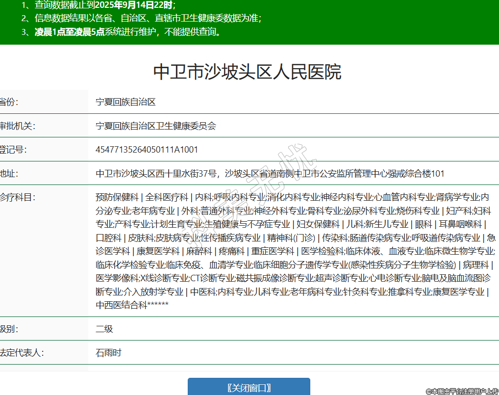 省份:寧夏回族自治區(qū)審批機(jī)關(guān):寧夏回族自治區(qū)衛(wèi)生健康委員會(huì)登記號(hào):45477135264050111A1001地址:中衛(wèi)市沙坡頭區(qū)西十里水街37號(hào),沙坡頭區(qū)省道南側(cè)中衛(wèi)市公安監(jiān)所管理中心強(qiáng)戒綜合樓101診療科目:預(yù)防保健科 | 全科醫(yī)療科 | 內(nèi)科;呼吸內(nèi)科專(zhuān)業(yè);消化內(nèi)科專(zhuān)業(yè);神經(jīng)內(nèi)科專(zhuān)業(yè);心血管內(nèi)科專(zhuān)業(yè);腎病學(xué)專(zhuān)業(yè);內(nèi)分泌專(zhuān)業(yè);老年病專(zhuān)業(yè) | 外科;普通外科專(zhuān)業(yè);神經(jīng)外科專(zhuān)業(yè);骨科專(zhuān)業(yè);泌尿外科專(zhuān)業(yè);燒傷科專(zhuān)業(yè) | 婦產(chǎn)科;婦科專(zhuān)業(yè);產(chǎn)科專(zhuān)業(yè);計(jì)劃生育專(zhuān)業(yè);生殖健康與不孕癥專(zhuān)業(yè) | 婦女保健科 | 兒科;新生兒專(zhuān)業(yè) | 眼科 | 耳鼻咽喉科 | 口腔科 | 皮膚科;皮膚病專(zhuān)業(yè);性傳播疾病專(zhuān)業(yè) | 精神科(門(mén)診) | 傳染科;腸道傳染病專(zhuān)業(yè);呼吸道傳染病專(zhuān)業(yè) | 急診醫(yī)學(xué)科 | 康復(fù)醫(yī)學(xué)科 | 麻醉科 | 疼痛科 | 重癥醫(yī)學(xué)科 | 醫(yī)學(xué)檢驗(yàn)科;臨床體液、血液專(zhuān)業(yè);臨床微生物學(xué)專(zhuān)業(yè);臨床化學(xué)檢驗(yàn)專(zhuān)業(yè);臨床免疫、血清學(xué)專(zhuān)業(yè);臨床細(xì)胞分子遺傳學(xué)專(zhuān)業(yè)(感染性疾病分子生物學(xué)檢驗(yàn)) | 病理科 | 醫(yī)學(xué)影像科;X線(xiàn)診斷專(zhuān)業(yè);CT診斷專(zhuān)業(yè);磁共振成像診斷專(zhuān)業(yè);超聲診斷專(zhuān)業(yè);心電診斷專(zhuān)業(yè);腦電及腦血流圖診斷專(zhuān)業(yè);介入放射學(xué)專(zhuān)業(yè) | 中醫(yī)科;內(nèi)科專(zhuān)業(yè);兒科專(zhuān)業(yè);老年病科專(zhuān)業(yè);針灸科專(zhuān)業(yè);推拿科專(zhuān)業(yè);康復(fù)醫(yī)學(xué)專(zhuān)業(yè) | 中西醫(yī)結(jié)合科******級(jí)別:二級(jí)法定代表人:石雨時(shí)主要負(fù)責(zé)人:石雨時(shí)執(zhí)業(yè)許可證有效期:2024/07/01 -至- 2039/06/30 -