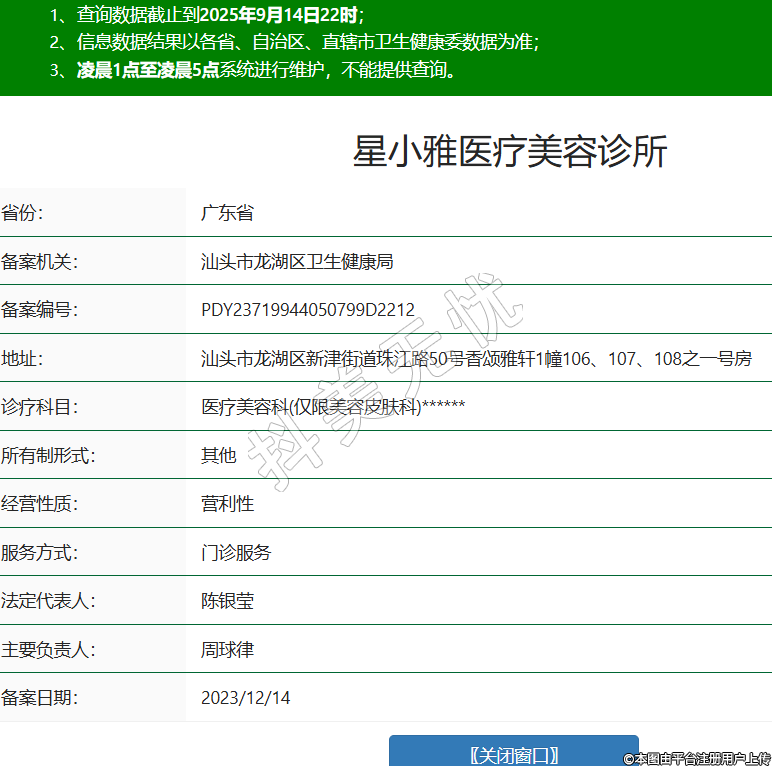 省份:廣東省備案機(jī)關(guān):汕頭市龍湖區(qū)衛(wèi)生健康局備案編號:PDY23719944050799D2212地址:汕頭市龍湖區(qū)新津街道珠江路50號香頌雅軒1幢106、107、108之一號房診療科目:醫(yī)療美容科(僅限美容皮膚科)******所有制形式:其他經(jīng)營性質(zhì):營利性服務(wù)方式:門診服務(wù)法定代表人:陳銀瑩主要負(fù)責(zé)人:周球律備案日期:2023/12/14 -