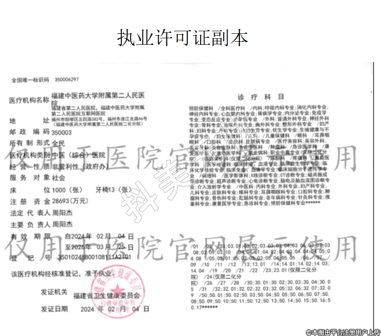 省份:福建省審批機(jī)關(guān):福建省衛(wèi)生健康委員會(huì)登記號(hào):35010248800108111A2101地址:福州市鼓樓區(qū)五四路282號(hào),福州市連江北路46號(hào)(福建中醫(yī)藥大學(xué)附屬第二人民醫(yī)院二化分院)診療科目:預(yù)防保健科 | 全科醫(yī)療科 | 內(nèi)科;呼吸內(nèi)科專業(yè);消化內(nèi)科專業(yè);神經(jīng)內(nèi)科專業(yè);心血管內(nèi)科專業(yè);腎病學(xué)專業(yè);內(nèi)分泌專業(yè);免疫學(xué)專業(yè);變態(tài)反應(yīng)專業(yè);老年病專業(yè) | 外科;普通外科專業(yè);神經(jīng)外科專業(yè);骨科專業(yè);泌尿外科專業(yè);胸外科專業(yè);整形外科專業(yè) | 婦產(chǎn)科;婦科專業(yè);產(chǎn)科專業(yè);計(jì)劃生育專業(yè);優(yōu)生學(xué)專業(yè);生殖健康與不孕癥專業(yè) | 婦女保健科 | 兒科 | 兒童保健科 | 眼科 | 耳鼻咽喉科 | 口腔科 | 皮膚科;皮膚病專業(yè) | 醫(yī)療美容科;美容外科;美容牙科;美容皮膚科;美容中醫(yī)科 | 腫瘤科 | 急診醫(yī)學(xué)科 | 康復(fù)醫(yī)學(xué)科 | 運(yùn)動(dòng)醫(yī)學(xué)科 | 職業(yè)病科;職業(yè)中毒專業(yè)(僅限二化分院) | 臨終關(guān)懷科(僅限二化分院) | 麻醉科 | 疼痛科 | 重癥醫(yī)學(xué)科 | 醫(yī)學(xué)檢驗(yàn)科;臨床體液、血液專業(yè);臨床微生物學(xué)專業(yè);臨床化學(xué)檢驗(yàn)專業(yè);臨床免疫、血清學(xué)專業(yè);臨床細(xì)胞分子遺傳學(xué)專業(yè) | 病理科 | 醫(yī)學(xué)影像科;X線診斷專業(yè);CT診斷專業(yè);磁共振成像診斷專業(yè);超聲診斷專業(yè);心電診斷專業(yè);腦電及腦血流圖診斷專業(yè);介入放射學(xué)專業(yè) | 中醫(yī)科;內(nèi)科專業(yè);外科專業(yè);婦產(chǎn)科專業(yè);兒科專業(yè);皮膚科專業(yè);眼科專業(yè);耳鼻咽喉科專業(yè);口腔科專業(yè);腫瘤科專業(yè);骨傷科專業(yè);肛腸科專業(yè);老年病科專業(yè);針灸科專業(yè);推拿科專業(yè);康復(fù)醫(yī)學(xué)專業(yè);急診科專業(yè);預(yù)防保健科專業(yè)******級(jí)別:三級(jí)法定代表人:周陽(yáng)杰主要負(fù)責(zé)人:周陽(yáng)杰執(zhí)業(yè)許可證有效期:2025/04/03 -至- 2026/03/25 -