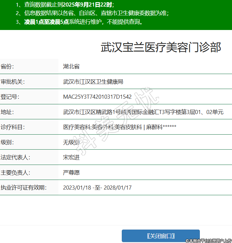 省份:湖北省審批機關(guān):武漢市江漢區(qū)衛(wèi)生健康局登記號:MAC25Y3T742010317D1542地址:武漢市江漢區(qū)精武路1號越秀國際金融匯T3寫字樓第3層01、02單元診療科目:醫(yī)療美容科;美容外科;美容皮膚科 | 麻醉科******級別:無級別法定代表人:宋宏進主要負責人:嚴尊愿執(zhí)業(yè)許可證有效期:2023/01/18 -至- 2028/01/17 -