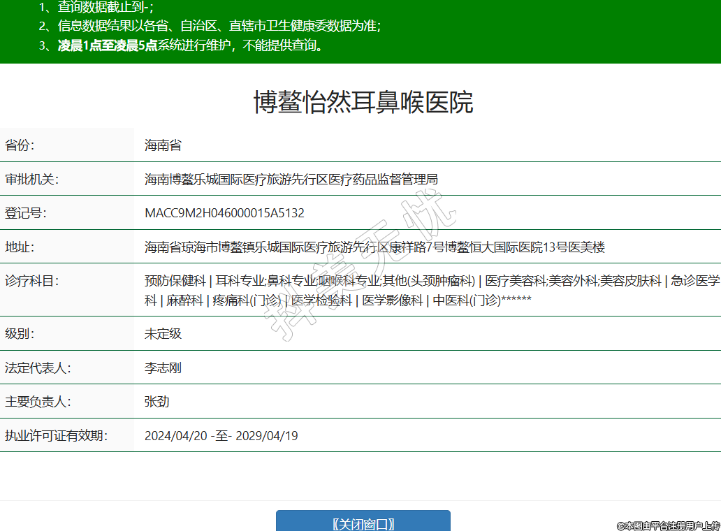省份:海南省審批機關(guān):海南博鰲樂城國際醫(yī)療旅游先行區(qū)醫(yī)療藥品監(jiān)督管理局登記號:MACC9M2H046000015A5132地址:海南省瓊海市博鰲鎮(zhèn)樂城國際醫(yī)療旅游先行區(qū)康祥路7號博鰲恒大國際醫(yī)院13號醫(yī)美樓診療科目:預(yù)防保健科 | 耳科專業(yè);鼻科專業(yè);咽喉科專業(yè);其他(頭頸腫瘤科) | 醫(yī)療美容科;美容外科;美容皮膚科 | 急診醫(yī)學(xué)科 | 麻醉科 | 疼痛科(門診) | 醫(yī)學(xué)檢驗科 | 醫(yī)學(xué)影像科 | 中醫(yī)科(門診)******級別:未定級法定代表人:李志剛主要負責(zé)人:張勁執(zhí)業(yè)許可證有效期:2024/04/20 -至- 2029/04/19 -