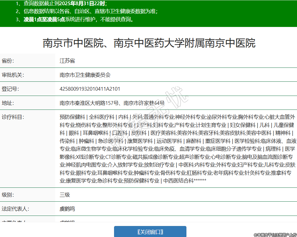 省份:江蘇省審批機(jī)關(guān):南京市衛(wèi)生健康委員會登記號:42580091932010411A2101地址:南京市秦淮區(qū)大明路157號、南京市許家巷44號診療科目:預(yù)防保健科 | 全科醫(yī)療科 | 內(nèi)科 | 外科;普通外科專業(yè);神經(jīng)外科專業(yè);泌尿外科專業(yè);胸外科專業(yè);心臟大血管外科專業(yè);燒傷科專業(yè);整形外科專業(yè) | 婦產(chǎn)科;婦科專業(yè);產(chǎn)科專業(yè);計(jì)劃生育專業(yè) | 婦女保健科 | 兒科 | 兒童保健科 | 眼科 | 耳鼻咽喉科 | 口腔科 | 皮膚科 | 醫(yī)療美容科;美容外科;美容牙科;美容皮膚科;美容中醫(yī)科 | 精神科 | 傳染科 | 腫瘤科 | 急診醫(yī)學(xué)科 | 康復(fù)醫(yī)學(xué)科 | 運(yùn)動醫(yī)學(xué)科 | 麻醉科 | 重癥醫(yī)學(xué)科 | 醫(yī)學(xué)檢驗(yàn)科;臨床體液、血液專業(yè);臨床微生物學(xué)專業(yè);臨床化學(xué)檢驗(yàn)專業(yè);臨床免疫、血清學(xué)專業(yè);臨床細(xì)胞分子遺傳學(xué)專業(yè) | 病理科 | 醫(yī)學(xué)影像科;X線診斷專業(yè);CT診斷專業(yè);磁共振成像診斷專業(yè);超聲診斷專業(yè);心電診斷專業(yè);腦電及腦血流圖診斷專業(yè);神經(jīng)肌肉電圖專業(yè);介入放射學(xué)專業(yè);放射治療專業(yè) | 中醫(yī)科;內(nèi)科專業(yè);外科專業(yè);婦產(chǎn)科專業(yè);兒科專業(yè);皮膚科專業(yè);眼科專業(yè);耳鼻咽喉科專業(yè);腫瘤科專業(yè);骨傷科專業(yè);肛腸科專業(yè);老年病科專業(yè);針灸科專業(yè);推拿科專業(yè);康復(fù)醫(yī)學(xué)專業(yè);急診科專業(yè);預(yù)防保健科專業(yè) | 中西醫(yī)結(jié)合科******級別:三級法定代表人:虞鶴鳴主要負(fù)責(zé)人:虞鶴鳴執(zhí)業(yè)許可證有效期:2025/02/12 -至- 2036/01/10 -