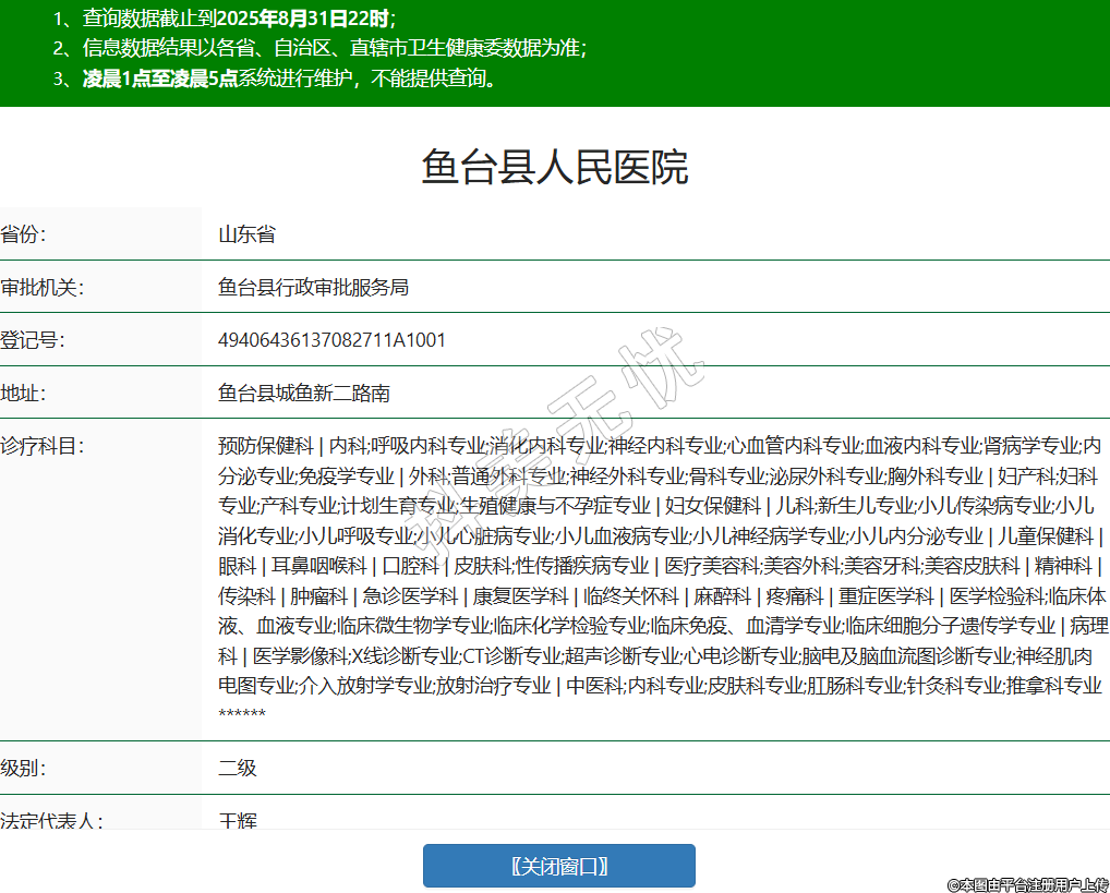 省份:山東省審批機關:魚臺縣行政審批服務局登記號:49406436137082711A1001地址:魚臺縣城魚新二路南診療科目:預防保健科 | 內(nèi)科;呼吸內(nèi)科專業(yè);消化內(nèi)科專業(yè);神經(jīng)內(nèi)科專業(yè);心血管內(nèi)科專業(yè);血液內(nèi)科專業(yè);腎病學專業(yè);內(nèi)分泌專業(yè);免疫學專業(yè) | 外科;普通外科專業(yè);神經(jīng)外科專業(yè);骨科專業(yè);泌尿外科專業(yè);胸外科專業(yè) | 婦產(chǎn)科;婦科專業(yè);產(chǎn)科專業(yè);計劃生育專業(yè);生殖健康與不孕癥專業(yè) | 婦女保健科 | 兒科;新生兒專業(yè);小兒傳染病專業(yè);小兒消化專業(yè);小兒呼吸專業(yè);小兒心臟病專業(yè);小兒血液病專業(yè);小兒神經(jīng)病學專業(yè);小兒內(nèi)分泌專業(yè) | 兒童保健科 | 眼科 | 耳鼻咽喉科 | 口腔科 | 皮膚科;性傳播疾病專業(yè) | 醫(yī)療美容科;美容外科;美容牙科;美容皮膚科 | 精神科 | 傳染科 | 腫瘤科 | 急診醫(yī)學科 | 康復醫(yī)學科 | 臨終關懷科 | 麻醉科 | 疼痛科 | 重癥醫(yī)學科 | 醫(yī)學檢驗科;臨床體液、血液專業(yè);臨床微生物學專業(yè);臨床化學檢驗專業(yè);臨床免疫、血清學專業(yè);臨床細胞分子遺傳學專業(yè) | 病理科 | 醫(yī)學影像科;X線診斷專業(yè);CT診斷專業(yè);超聲診斷專業(yè);心電診斷專業(yè);腦電及腦血流圖診斷專業(yè);神經(jīng)肌肉電圖專業(yè);介入放射學專業(yè);放射治療專業(yè) | 中醫(yī)科;內(nèi)科專業(yè);皮膚科專業(yè);肛腸科專業(yè);針灸科專業(yè);推拿科專業(yè)******級別:二級法定代表人:王輝主要負責人:王輝執(zhí)業(yè)許可證有效期:2025/07/22 -至- 2040/01/09 -