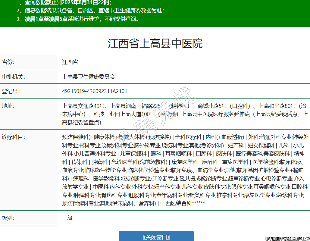 省份:江西省審批機(jī)關(guān):上高縣衛(wèi)生健康委員會(huì)登記號(hào):49215019-436092311A2101地址:上高縣交通路49號(hào)、上高縣河南幸福路225號(hào)(精神科)、商城北路5號(hào)(口腔科)、上高和平路80號(hào)(治未病中心)、科技工業(yè)園上高大道100號(hào)(感染樓)上高縣中醫(yī)院醫(yī)療服務(wù)延伸點(diǎn)(上高縣紀(jì)委談話點(diǎn)、上高縣紀(jì)委留置點(diǎn))診療科目:預(yù)防保健科(+健康體檢+駕駛?cè)梭w檢+預(yù)防接種) | 全科醫(yī)療科 | 內(nèi)科(+血液透析) | 外科;普通外科專(zhuān)業(yè);神經(jīng)外科專(zhuān)業(yè);骨科專(zhuān)業(yè);泌尿外科專(zhuān)業(yè);胸外科專(zhuān)業(yè);燒傷科專(zhuān)業(yè);其他(急診外科) | 婦產(chǎn)科 | 婦女保健科 | 兒科 | 小兒外科;小兒普通外科專(zhuān)業(yè) | 兒童保健科 | 眼科 | 耳鼻咽喉科 | 口腔科 | 皮膚科 | 醫(yī)療美容科;美容皮膚科 | 精神科 | 傳染科 | 腫瘤科 | 急診醫(yī)學(xué)科(院前急救科) | 康復(fù)醫(yī)學(xué)科 | 麻醉科 | 重癥醫(yī)學(xué)科 | 醫(yī)學(xué)檢驗(yàn)科;臨床體液、血液專(zhuān)業(yè);臨床微生物學(xué)專(zhuān)業(yè);臨床化學(xué)檢驗(yàn)專(zhuān)業(yè);臨床免疫、血清學(xué)專(zhuān)業(yè);其他(臨床基因擴(kuò)增檢驗(yàn)專(zhuān)業(yè)+輸血科) | 病理科 | 醫(yī)學(xué)影像科;X線診斷專(zhuān)業(yè);CT診斷專(zhuān)業(yè);磁共振成像診斷專(zhuān)業(yè);超聲診斷專(zhuān)業(yè);心電診斷專(zhuān)業(yè);介入放射學(xué)專(zhuān)業(yè) | 中醫(yī)科;內(nèi)科專(zhuān)業(yè);外科專(zhuān)業(yè);婦產(chǎn)科專(zhuān)業(yè);兒科專(zhuān)業(yè);皮膚科專(zhuān)業(yè);眼科專(zhuān)業(yè);耳鼻咽喉科專(zhuān)業(yè);口腔科專(zhuān)業(yè);腫瘤科專(zhuān)業(yè);骨傷科專(zhuān)業(yè);肛腸科專(zhuān)業(yè);老年病科專(zhuān)業(yè);針灸科專(zhuān)業(yè);推拿科專(zhuān)業(yè);康復(fù)醫(yī)學(xué)專(zhuān)業(yè);急診科專(zhuān)業(yè);預(yù)防保健科專(zhuān)業(yè);其他(治未病科、營(yíng)養(yǎng)科) | 中西醫(yī)結(jié)合科******級(jí)別:三級(jí)法定代表人:周榮主要負(fù)責(zé)人:周建平執(zhí)業(yè)許可證有效期:2022/11/02 -至- 2027/11/01 -