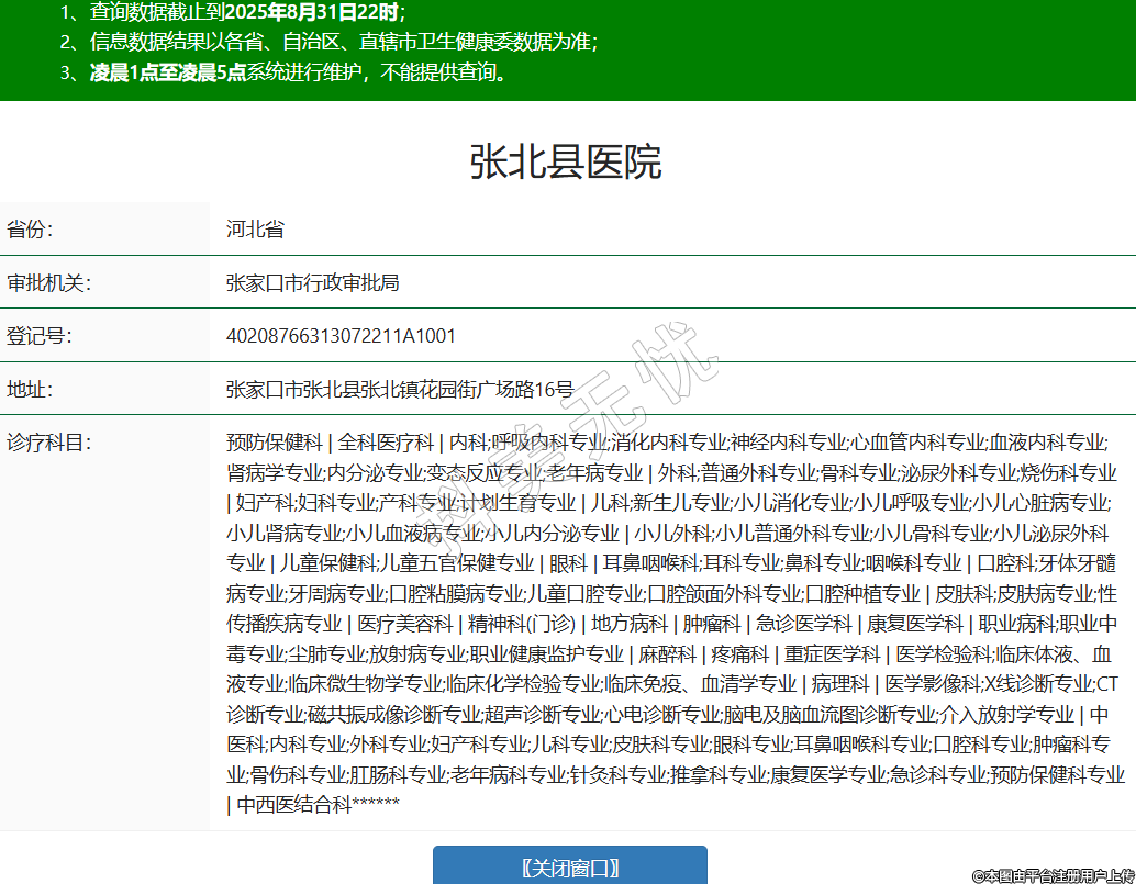 省份:河北省審批機(jī)關(guān):張家口市行政審批局登記號(hào):40208766313072211A1001地址:張家口市張北縣張北鎮(zhèn)花園街廣場路16號(hào)診療科目:預(yù)防保健科 | 全科醫(yī)療科 | 內(nèi)科;呼吸內(nèi)科專業(yè);消化內(nèi)科專業(yè);神經(jīng)內(nèi)科專業(yè);心血管內(nèi)科專業(yè);血液內(nèi)科專業(yè);腎病學(xué)專業(yè);內(nèi)分泌專業(yè);變態(tài)反應(yīng)專業(yè);老年病專業(yè) | 外科;普通外科專業(yè);骨科專業(yè);泌尿外科專業(yè);燒傷科專業(yè) | 婦產(chǎn)科;婦科專業(yè);產(chǎn)科專業(yè);計(jì)劃生育專業(yè) | 兒科;新生兒專業(yè);小兒消化專業(yè);小兒呼吸專業(yè);小兒心臟病專業(yè);小兒腎病專業(yè);小兒血液病專業(yè);小兒內(nèi)分泌專業(yè) | 小兒外科;小兒普通外科專業(yè);小兒骨科專業(yè);小兒泌尿外科專業(yè) | 兒童保健科;兒童五官保健專業(yè) | 眼科 | 耳鼻咽喉科;耳科專業(yè);鼻科專業(yè);咽喉科專業(yè) | 口腔科;牙體牙髓病專業(yè);牙周病專業(yè);口腔粘膜病專業(yè);兒童口腔專業(yè);口腔頜面外科專業(yè);口腔種植專業(yè) | 皮膚科;皮膚病專業(yè);性傳播疾病專業(yè) | 醫(yī)療美容科 | 精神科(門診) | 地方病科 | 腫瘤科 | 急診醫(yī)學(xué)科 | 康復(fù)醫(yī)學(xué)科 | 職業(yè)病科;職業(yè)中毒專業(yè);塵肺專業(yè);放射病專業(yè);職業(yè)健康監(jiān)護(hù)專業(yè) | 麻醉科 | 疼痛科 | 重癥醫(yī)學(xué)科 | 醫(yī)學(xué)檢驗(yàn)科;臨床體液、血液專業(yè);臨床微生物學(xué)專業(yè);臨床化學(xué)檢驗(yàn)專業(yè);臨床免疫、血清學(xué)專業(yè) | 病理科 | 醫(yī)學(xué)影像科;X線診斷專業(yè);CT診斷專業(yè);磁共振成像診斷專業(yè);超聲診斷專業(yè);心電診斷專業(yè);腦電及腦血流圖診斷專業(yè);介入放射學(xué)專業(yè) | 中醫(yī)科;內(nèi)科專業(yè);外科專業(yè);婦產(chǎn)科專業(yè);兒科專業(yè);皮膚科專業(yè);眼科專業(yè);耳鼻咽喉科專業(yè);口腔科專業(yè);腫瘤科專業(yè);骨傷科專業(yè);肛腸科專業(yè);老年病科專業(yè);針灸科專業(yè);推拿科專業(yè);康復(fù)醫(yī)學(xué)專業(yè);急診科專業(yè);預(yù)防保健科專業(yè) | 中西醫(yī)結(jié)合科******級別:二級法定代表人:胡萬朝主要負(fù)責(zé)人:胡萬朝執(zhí)業(yè)許可證有效期:2024/08/07 -至- 2029/12/31 -