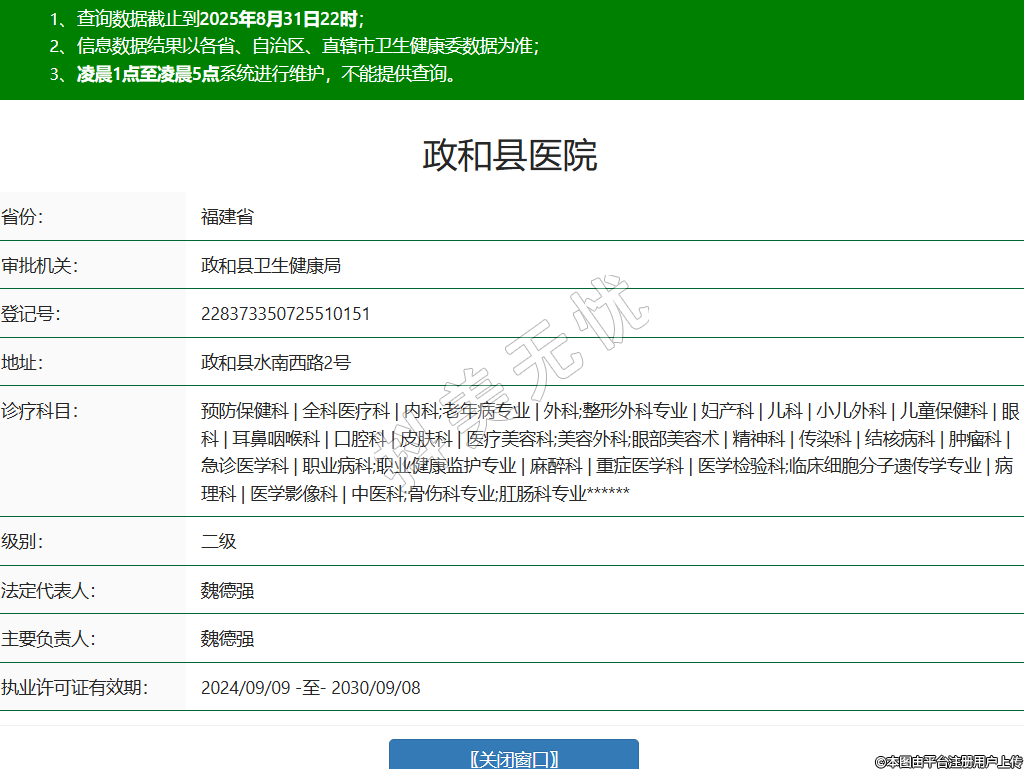 省份:福建省審批機關(guān):政和縣衛(wèi)生健康局登記號:228373350725510151地址:政和縣水南西路2號診療科目:預(yù)防保健科 | 全科醫(yī)療科 | 內(nèi)科;老年病專業(yè) | 外科;整形外科專業(yè) | 婦產(chǎn)科 | 兒科 | 小兒外科 | 兒童保健科 | 眼科 | 耳鼻咽喉科 | 口腔科 | 皮膚科 | 醫(yī)療美容科;美容外科;眼部美容術(shù) | 精神科 | 傳染科 | 結(jié)核病科 | 腫瘤科 | 急診醫(yī)學(xué)科 | 職業(yè)病科;職業(yè)健康監(jiān)護專業(yè) | 麻醉科 | 重癥醫(yī)學(xué)科 | 醫(yī)學(xué)檢驗科;臨床細(xì)胞分子遺傳學(xué)專業(yè) | 病理科 | 醫(yī)學(xué)影像科 | 中醫(yī)科;骨傷科專業(yè);肛腸科專業(yè)******級別:二級法定代表人:魏德強主要負(fù)責(zé)人:魏德強執(zhí)業(yè)許可證有效期:2024/09/09 -至- 2030/09/08 -