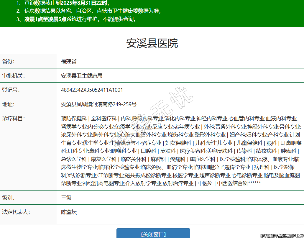 省份:福建省審批機(jī)關(guān):安溪縣衛(wèi)生健康局登記號:48942342X35052411A1001地址:安溪縣鳳城鎮(zhèn)河濱南路249-259號診療科目:預(yù)防保健科 | 全科醫(yī)療科 | 內(nèi)科;呼吸內(nèi)科專業(yè);消化內(nèi)科專業(yè);神經(jīng)內(nèi)科專業(yè);心血管內(nèi)科專業(yè);血液內(nèi)科專業(yè);腎病學(xué)專業(yè);內(nèi)分泌專業(yè);免疫學(xué)專業(yè);變態(tài)反應(yīng)專業(yè);老年病專業(yè) | 外科;普通外科專業(yè);神經(jīng)外科專業(yè);骨科專業(yè);泌尿外科專業(yè);胸外科專業(yè);心臟大血管外科專業(yè);燒傷科專業(yè);整形外科專業(yè) | 婦產(chǎn)科;婦科專業(yè);產(chǎn)科專業(yè);計(jì)劃生育專業(yè);優(yōu)生學(xué)專業(yè);生殖健康與不孕癥專業(yè) | 婦女保健科 | 兒科;新生兒專業(yè) | 兒童保健科 | 眼科 | 耳鼻咽喉科;耳科專業(yè);鼻科專業(yè);咽喉科專業(yè) | 口腔科 | 皮膚科 | 醫(yī)療美容科;美容皮膚科 | 傳染科 | 結(jié)核病科 | 腫瘤科 | 急診醫(yī)學(xué)科 | 康復(fù)醫(yī)學(xué)科 | 臨終關(guān)懷科 | 麻醉科 | 疼痛科 | 重癥醫(yī)學(xué)科 | 醫(yī)學(xué)檢驗(yàn)科;臨床體液、血液專業(yè);臨床微生物學(xué)專業(yè);臨床化學(xué)檢驗(yàn)專業(yè);臨床免疫、血清學(xué)專業(yè);臨床細(xì)胞分子遺傳學(xué)專業(yè) | 病理科 | 醫(yī)學(xué)影像科;X線診斷專業(yè);CT診斷專業(yè);磁共振成像診斷專業(yè);核醫(yī)學(xué)專業(yè);超聲診斷專業(yè);心電診斷專業(yè);腦電及腦血流圖診斷專業(yè);神經(jīng)肌肉電圖專業(yè);介入放射學(xué)專業(yè);放射治療專業(yè) | 中醫(yī)科 | 中西醫(yī)結(jié)合科******級別:三級法定代表人:陳鑫壇主要負(fù)責(zé)人:陳鑫壇執(zhí)業(yè)許可證有效期:2022/10/01 -至- 2028/09/30 -