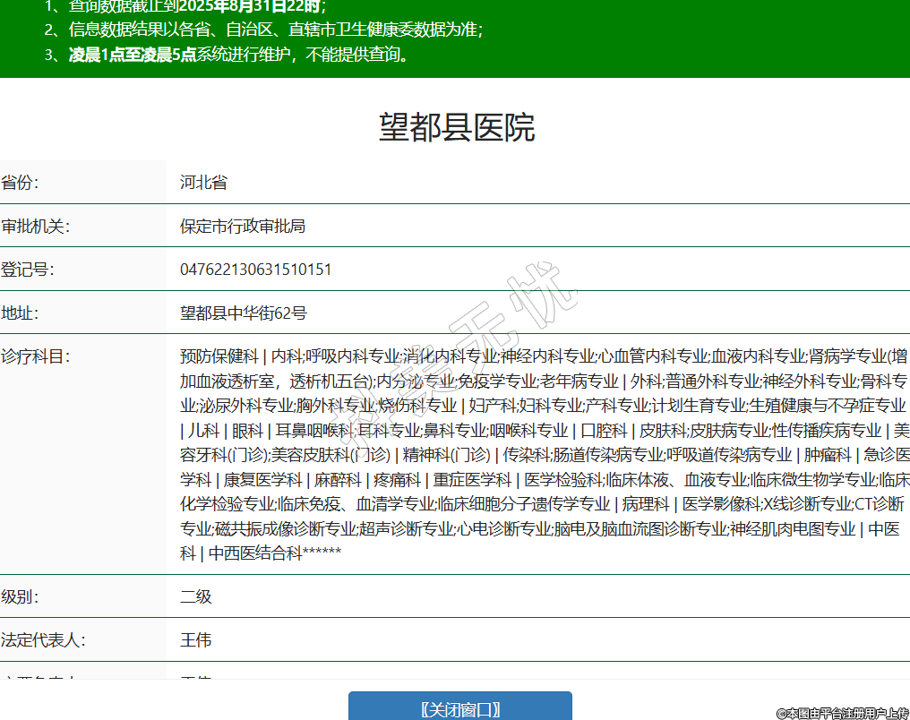 省份:河北省審批機(jī)關(guān):保定市行政審批局登記號(hào):047622130631510151地址:望都縣中華街62號(hào)診療科目:預(yù)防保健科 | 內(nèi)科;呼吸內(nèi)科專業(yè);消化內(nèi)科專業(yè);神經(jīng)內(nèi)科專業(yè);心血管內(nèi)科專業(yè);血液內(nèi)科專業(yè);腎病學(xué)專業(yè)(增加血液透析室,透析機(jī)五臺(tái));內(nèi)分泌專業(yè);免疫學(xué)專業(yè);老年病專業(yè) | 外科;普通外科專業(yè);神經(jīng)外科專業(yè);骨科專業(yè);泌尿外科專業(yè);胸外科專業(yè);燒傷科專業(yè) | 婦產(chǎn)科;婦科專業(yè);產(chǎn)科專業(yè);計(jì)劃生育專業(yè);生殖健康與不孕癥專業(yè) | 兒科 | 眼科 | 耳鼻咽喉科;耳科專業(yè);鼻科專業(yè);咽喉科專業(yè) | 口腔科 | 皮膚科;皮膚病專業(yè);性傳播疾病專業(yè) | 美容牙科(門診);美容皮膚科(門診) | 精神科(門診) | 傳染科;腸道傳染病專業(yè);呼吸道傳染病專業(yè) | 腫瘤科 | 急診醫(yī)學(xué)科 | 康復(fù)醫(yī)學(xué)科 | 麻醉科 | 疼痛科 | 重癥醫(yī)學(xué)科 | 醫(yī)學(xué)檢驗(yàn)科;臨床體液、血液專業(yè);臨床微生物學(xué)專業(yè);臨床化學(xué)檢驗(yàn)專業(yè);臨床免疫、血清學(xué)專業(yè);臨床細(xì)胞分子遺傳學(xué)專業(yè) | 病理科 | 醫(yī)學(xué)影像科;X線診斷專業(yè);CT診斷專業(yè);磁共振成像診斷專業(yè);超聲診斷專業(yè);心電診斷專業(yè);腦電及腦血流圖診斷專業(yè);神經(jīng)肌肉電圖專業(yè) | 中醫(yī)科 | 中西醫(yī)結(jié)合科******級(jí)別:二級(jí)法定代表人:王偉主要負(fù)責(zé)人:王偉執(zhí)業(yè)許可證有效期:2023/07/01 -至- 2038/06/30 -