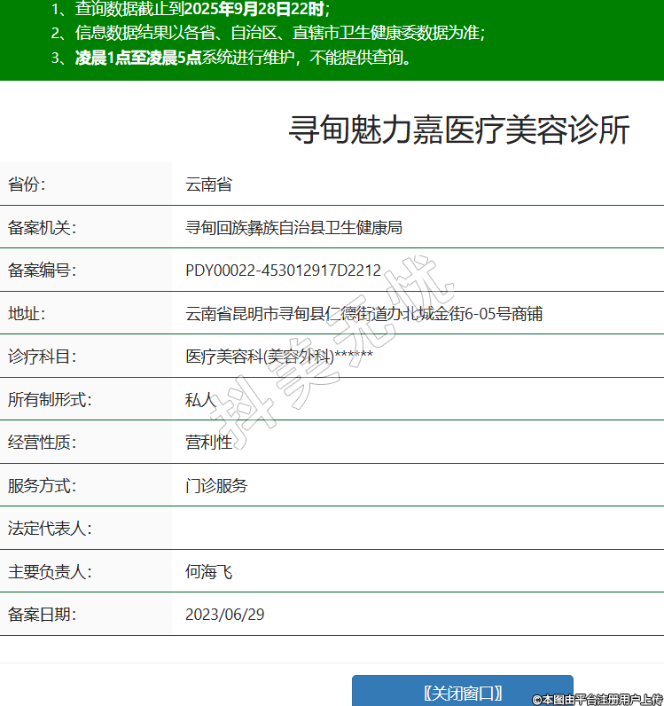 省份:云南省備案機(jī)關(guān):尋甸回族彝族自治縣衛(wèi)生健康局備案編號(hào):PDY00022-453012917D2212地址:云南省昆明市尋甸縣仁德街道辦北城金街6-05號(hào)商鋪診療科目:醫(yī)療美容科(美容外科)******所有制形式:私人經(jīng)營(yíng)性質(zhì):營(yíng)利性服務(wù)方式:門診服務(wù)法定代表人:主要負(fù)責(zé)人:何海飛備案日期:2023/06/29 -