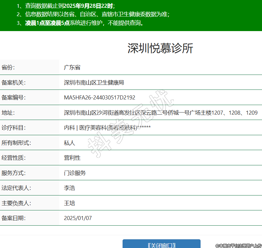 省份:廣東省備案機(jī)關(guān):深圳市南山區(qū)衛(wèi)生健康局備案編號(hào):MA5HFA26-244030517D2192地址:深圳市南山區(qū)沙河街道高發(fā)社區(qū)深云路二號(hào)僑城一號(hào)廣場(chǎng)主樓1207、1208、1209診療科目:內(nèi)科 | 醫(yī)療美容科(美容皮膚科)******所有制形式:私人經(jīng)營(yíng)性質(zhì):營(yíng)利性服務(wù)方式:門(mén)診服務(wù)法定代表人:李浩主要負(fù)責(zé)人:王培備案日期:2025/01/07 -