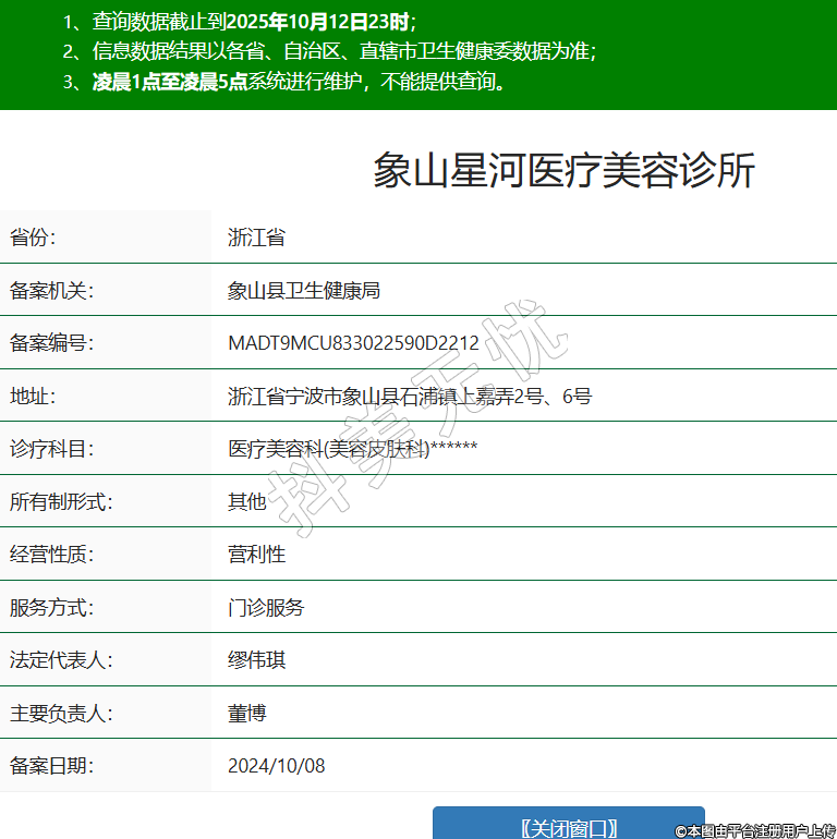 省份:浙江省備案機(jī)關(guān):象山縣衛(wèi)生健康局備案編號:MADT9MCU833022590D2212地址:浙江省寧波市象山縣石浦鎮(zhèn)上嘉弄2號、6號診療科目:醫(yī)療美容科(美容皮膚科)******所有制形式:其他經(jīng)營性質(zhì):營利性服務(wù)方式:門診服務(wù)法定代表人:繆偉琪主要負(fù)責(zé)人:董博備案日期:2024/10/08 -