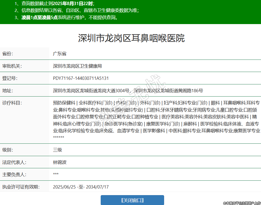 省份:廣東省審批機(jī)關(guān):深圳市龍崗區(qū)衛(wèi)生健康局登記號(hào):PDY71167-144030711A5131地址:深圳市龍崗區(qū)龍城街道龍崗大道3004號(hào),深圳市龍崗區(qū)龍城街道黃閣路186號(hào)診療科目:預(yù)防保健科 | 全科醫(yī)療科(門診) | 內(nèi)科(門診) | 外科(門診) | 婦產(chǎn)科;婦科專業(yè)(門診) | 眼科 | 耳鼻咽喉科;耳科專業(yè);鼻科專業(yè);咽喉科專業(yè);其他(頭頸腫瘤科專業(yè)) | 口腔科;牙體牙髓病專業(yè);牙周病專業(yè);兒童口腔專業(yè);口腔頜面外科專業(yè);口腔修復(fù)專業(yè);口腔正畸專業(yè);口腔種植專業(yè) | 醫(yī)療美容科;美容外科;美容皮膚科;美容中醫(yī)科 | 精神科;臨床心理專業(yè)(門診) | 急診醫(yī)學(xué)科(急診室) | 康復(fù)醫(yī)學(xué)科(門診) | 麻醉科 | 醫(yī)學(xué)檢驗(yàn)科;臨床體液、血液專業(yè);臨床化學(xué)檢驗(yàn)專業(yè);臨床免疫、血清學(xué)專業(yè) | 醫(yī)學(xué)影像科 | 中醫(yī)科;眼科專業(yè);耳鼻咽喉科專業(yè);康復(fù)醫(yī)學(xué)專業(yè)******級(jí)別:三級(jí)法定代表人:林錦波主要負(fù)責(zé)人:***執(zhí)業(yè)許可證有效期:2025/06/25 -至- 2034/07/17 -