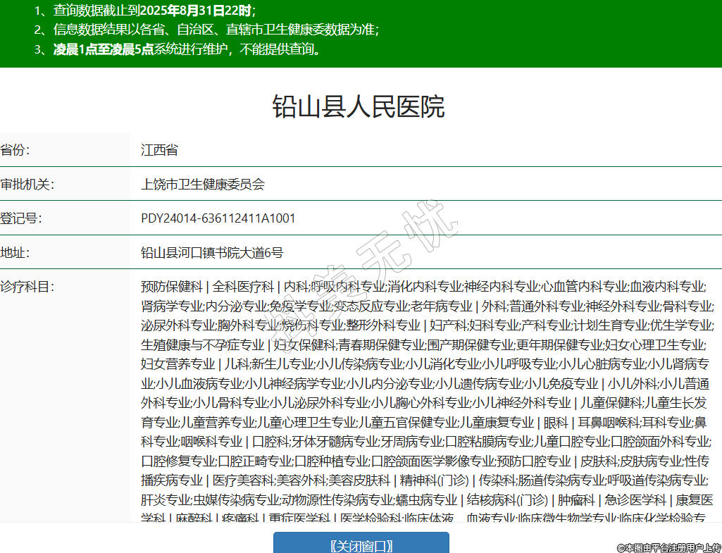 省份:江西省審批機(jī)關(guān):上饒市衛(wèi)生健康委員會登記號:PDY24014-636112411A1001地址:鉛山縣河口鎮(zhèn)書院大道6號診療科目:預(yù)防保健科 | 全科醫(yī)療科 | 內(nèi)科;呼吸內(nèi)科專業(yè);消化內(nèi)科專業(yè);神經(jīng)內(nèi)科專業(yè);心血管內(nèi)科專業(yè);血液內(nèi)科專業(yè);腎病學(xué)專業(yè);內(nèi)分泌專業(yè);免疫學(xué)專業(yè);變態(tài)反應(yīng)專業(yè);老年病專業(yè) | 外科;普通外科專業(yè);神經(jīng)外科專業(yè);骨科專業(yè);泌尿外科專業(yè);胸外科專業(yè);燒傷科專業(yè);整形外科專業(yè) | 婦產(chǎn)科;婦科專業(yè);產(chǎn)科專業(yè);計(jì)劃生育專業(yè);優(yōu)生學(xué)專業(yè);生殖健康與不孕癥專業(yè) | 婦女保健科;青春期保健專業(yè);圍產(chǎn)期保健專業(yè);更年期保健專業(yè);婦女心理衛(wèi)生專業(yè);婦女營養(yǎng)專業(yè) | 兒科;新生兒專業(yè);小兒傳染病專業(yè);小兒消化專業(yè);小兒呼吸專業(yè);小兒心臟病專業(yè);小兒腎病專業(yè);小兒血液病專業(yè);小兒神經(jīng)病學(xué)專業(yè);小兒內(nèi)分泌專業(yè);小兒遺傳病專業(yè);小兒免疫專業(yè) | 小兒外科;小兒普通外科專業(yè);小兒骨科專業(yè);小兒泌尿外科專業(yè);小兒胸心外科專業(yè);小兒神經(jīng)外科專業(yè) | 兒童保健科;兒童生長發(fā)育專業(yè);兒童營養(yǎng)專業(yè);兒童心理衛(wèi)生專業(yè);兒童五官保健專業(yè);兒童康復(fù)專業(yè) | 眼科 | 耳鼻咽喉科;耳科專業(yè);鼻科專業(yè);咽喉科專業(yè) | 口腔科;牙體牙髓病專業(yè);牙周病專業(yè);口腔粘膜病專業(yè);兒童口腔專業(yè);口腔頜面外科專業(yè);口腔修復(fù)專業(yè);口腔正畸專業(yè);口腔種植專業(yè);口腔頜面醫(yī)學(xué)影像專業(yè);預(yù)防口腔專業(yè) | 皮膚科;皮膚病專業(yè);性傳播疾病專業(yè) | 醫(yī)療美容科;美容外科;美容皮膚科 | 精神科(門診) | 傳染科;腸道傳染病專業(yè);呼吸道傳染病專業(yè);肝炎專業(yè);蟲媒傳染病專業(yè);動物源性傳染病專業(yè);蠕蟲病專業(yè) | 結(jié)核病科(門診) | 腫瘤科 | 急診醫(yī)學(xué)科 | 康復(fù)醫(yī)學(xué)科 | 麻醉科 | 疼痛科 | 重癥醫(yī)學(xué)科 | 醫(yī)學(xué)檢驗(yàn)科;臨床體液、血液專業(yè);臨床微生物學(xué)專業(yè);臨床化學(xué)檢驗(yàn)專業(yè);臨床免疫、血清學(xué)專業(yè);臨床細(xì)胞分子遺傳學(xué)專業(yè)(新冠肺炎病毒核酸檢測,乙型肝炎病毒脫氧核糖核酸擴(kuò)增定量檢測,結(jié)核、非結(jié)核分枝桿菌核酸檢測,分枝桿菌菌種鑒定,人類免疫缺陷病毒-核糖核酸擴(kuò)增定量檢測,結(jié)核分枝桿菌耐藥基因檢測。) | 病理科 | 醫(yī)學(xué)影像科;X線診斷專業(yè);CT診斷專業(yè);磁共振成像診斷專業(yè);超聲診斷專業(yè);心電診斷專業(yè);腦電及腦血流圖診斷專業(yè);神經(jīng)肌肉電圖專業(yè);介入放射學(xué)專業(yè) | 中醫(yī)科;內(nèi)科專業(yè);婦產(chǎn)科專業(yè);兒科專業(yè);骨傷科專業(yè);老年病科專業(yè);針灸科專業(yè);推拿科專業(yè);康復(fù)醫(yī)學(xué)專業(yè) | 中西醫(yī)結(jié)合科******級別:三級法定代表人:李成宇主要負(fù)責(zé)人:李成宇執(zhí)業(yè)許可證有效期:2022/07/28 -至- 2037/07/27 -