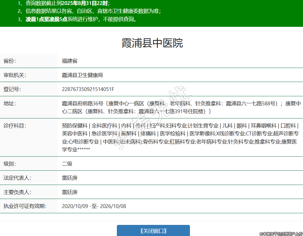 省份:福建省審批機關:霞浦縣衛(wèi)生健康局登記號:228767350921514051F地址:霞浦縣府前路36號〔康復中心一病區(qū)(康復科、老年病科、針灸推拿科:霞浦縣六一七路588號);康復中心二病區(qū)(康復科、針灸推拿科:霞浦縣六一七路391號住院樓)〕診療科目:預防保健科 | 全科醫(yī)療科 | 內科 | 外科 | 婦產科;婦科專業(yè);計劃生育專業(yè) | 兒科 | 眼科 | 耳鼻咽喉科 | 口腔科 | 美容中醫(yī)科 | 急診醫(yī)學科 | 麻醉科 | 疼痛科 | 醫(yī)學檢驗科 | 醫(yī)學影像科;X線診斷專業(yè);CT診斷專業(yè);超聲診斷專業(yè);心電診斷專業(yè) | 中醫(yī)科(治未病科);骨傷科專業(yè);肛腸科專業(yè);老年病科專業(yè);針灸科專業(yè);推拿科專業(yè);康復醫(yī)學專業(yè)******級別:二級法定代表人:雷廷庚主要負責人:雷廷庚執(zhí)業(yè)許可證有效期:2020/10/09 -至- 2026/10/08 -