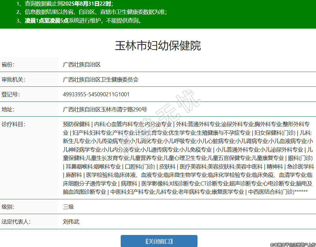 省份:廣西壯族自治區(qū)審批機關:廣西壯族自治區(qū)衛(wèi)生健康委員會登記號:49933955-545090211G1001地址:廣西壯族自治區(qū)玉林市清寧路290號診療科目:預防保健科 | 內(nèi)科;心血管內(nèi)科專業(yè);內(nèi)分泌專業(yè) | 外科;普通外科專業(yè);泌尿外科專業(yè);胸外科專業(yè);整形外科專業(yè) | 婦產(chǎn)科;婦科專業(yè);產(chǎn)科專業(yè);計劃生育專業(yè);優(yōu)生學專業(yè);生殖健康與不孕癥專業(yè) | 婦女保健科(門診) | 兒科;新生兒專業(yè);小兒傳染病專業(yè);小兒消化專業(yè);小兒呼吸專業(yè);小兒心臟病專業(yè);小兒腎病專業(yè);小兒血液病專業(yè);小兒神經(jīng)病學專業(yè);小兒內(nèi)分泌專業(yè);小兒遺傳病專業(yè);小兒免疫專業(yè) | 小兒普通外科專業(yè);小兒泌尿外科專業(yè) | 兒童保健科;兒童生長發(fā)育專業(yè);兒童營養(yǎng)專業(yè);兒童心理衛(wèi)生專業(yè);兒童五官保健專業(yè);兒童康復專業(yè) | 眼科(門診) | 耳鼻咽喉科;咽喉科專業(yè) | 口腔科(門診) | 皮膚科 | 醫(yī)療美容科;美容皮膚科;美容中醫(yī)科 | 精神科 | 急診醫(yī)學科 | 麻醉科 | 醫(yī)學檢驗科;臨床體液、血液專業(yè);臨床微生物學專業(yè);臨床化學檢驗專業(yè);臨床免疫、血清學專業(yè);臨床細胞分子遺傳學專業(yè) | 病理科 | 醫(yī)學影像科;X線診斷專業(yè);CT診斷專業(yè);超聲診斷專業(yè);心電診斷專業(yè);腦電及腦血流圖診斷專業(yè) | 中醫(yī)科;婦產(chǎn)科專業(yè);兒科專業(yè);老年病科專業(yè);康復醫(yī)學專業(yè) | 中西醫(yī)結合科(門診)******級別:三級法定代表人:劉偉武主要負責人:劉偉武執(zhí)業(yè)許可證有效期:2017/05/07 -至- 2032/05/06 -