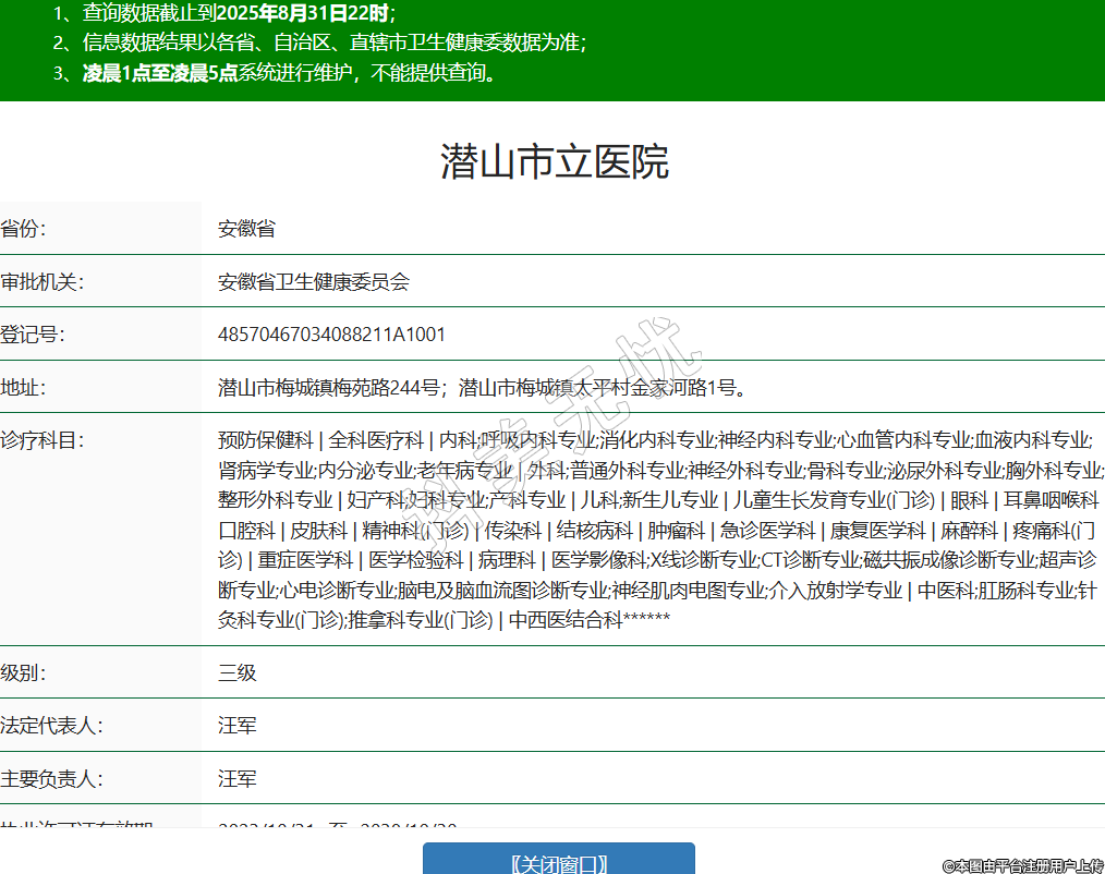 省份:安徽省審批機關(guān):安徽省衛(wèi)生健康委員會登記號:48570467034088211A1001地址:潛山市梅城鎮(zhèn)梅苑路244號;潛山市梅城鎮(zhèn)太平村金家河路1號。診療科目:預(yù)防保健科 | 全科醫(yī)療科 | 內(nèi)科;呼吸內(nèi)科專業(yè);消化內(nèi)科專業(yè);神經(jīng)內(nèi)科專業(yè);心血管內(nèi)科專業(yè);血液內(nèi)科專業(yè);腎病學(xué)專業(yè);內(nèi)分泌專業(yè);老年病專業(yè) | 外科;普通外科專業(yè);神經(jīng)外科專業(yè);骨科專業(yè);泌尿外科專業(yè);胸外科專業(yè);整形外科專業(yè) | 婦產(chǎn)科;婦科專業(yè);產(chǎn)科專業(yè) | 兒科;新生兒專業(yè) | 兒童生長發(fā)育專業(yè)(門診) | 眼科 | 耳鼻咽喉科 | 口腔科 | 皮膚科 | 精神科(門診) | 傳染科 | 結(jié)核病科 | 腫瘤科 | 急診醫(yī)學(xué)科 | 康復(fù)醫(yī)學(xué)科 | 麻醉科 | 疼痛科(門診) | 重癥醫(yī)學(xué)科 | 醫(yī)學(xué)檢驗科 | 病理科 | 醫(yī)學(xué)影像科;X線診斷專業(yè);CT診斷專業(yè);磁共振成像診斷專業(yè);超聲診斷專業(yè);心電診斷專業(yè);腦電及腦血流圖診斷專業(yè);神經(jīng)肌肉電圖專業(yè);介入放射學(xué)專業(yè) | 中醫(yī)科;肛腸科專業(yè);針灸科專業(yè)(門診);推拿科專業(yè)(門診) | 中西醫(yī)結(jié)合科******級別:三級法定代表人:汪軍主要負責(zé)人:汪軍執(zhí)業(yè)許可證有效期:2023/10/31 -至- 2038/10/30 -